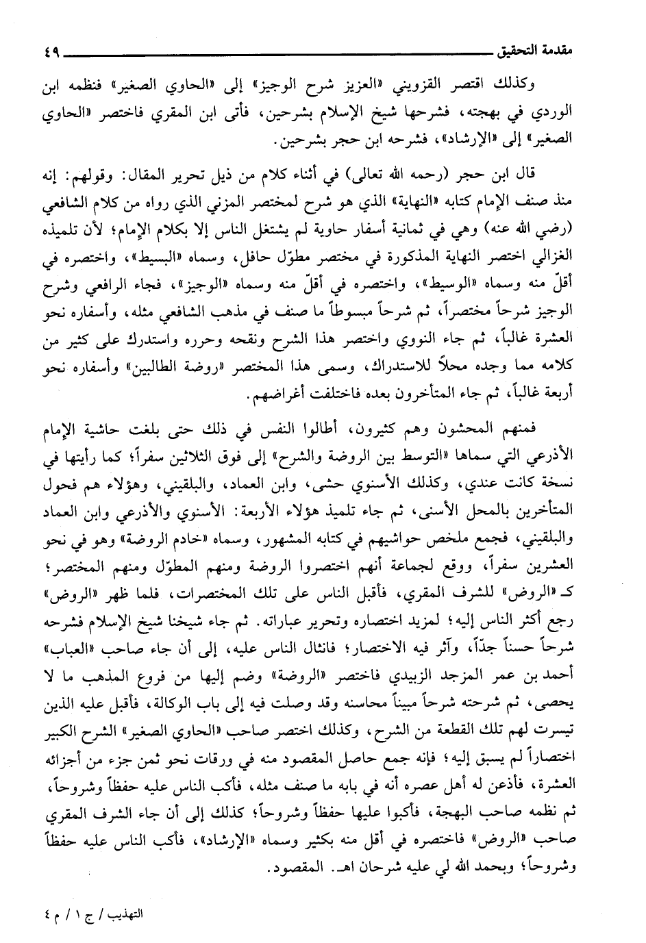 قال ابن حجر (رحمه الله تعالى) في أثناء كلام من ذيل تحرير المقال: وقولهم: إنه منذ صنف الإمام كتابه "النهاية" الذي هو شرحه لمختصر المزني الذي رواه من كلام الشافعي (رضي الله عنه) وهي في ثمانية أسفار حاوية لم يشتغل الناس إلا بكلام الإمام؛ لأن تلميذه الغزالي اختصر النهاية المذكورة في مختصر مطول حافل، وسماه "البسيط"، واختصره في أقل منه وسماه "الوسيط"، واختصره في أقل منه وسماه "الوجيز"، فجاء الرافعي وشرح الوجيز شرحاً مختصراً، ثم شرحاً مبسوطاً ما صنف في مذهب الشافعي مثله، وأسفاره نحو العشرة غالباً، ثم جاء النووي واختصر هذا الشرح ونقحه وحرره واستدرك على كثير من كلامه مما وجده محلاً للاستدراك، وسمى هذا المختصر "روضة الطالبين" وأسفاره نحو أربعة غالباً، ثم جاء المتأخرون بعده فاختلفت أغراضهم.