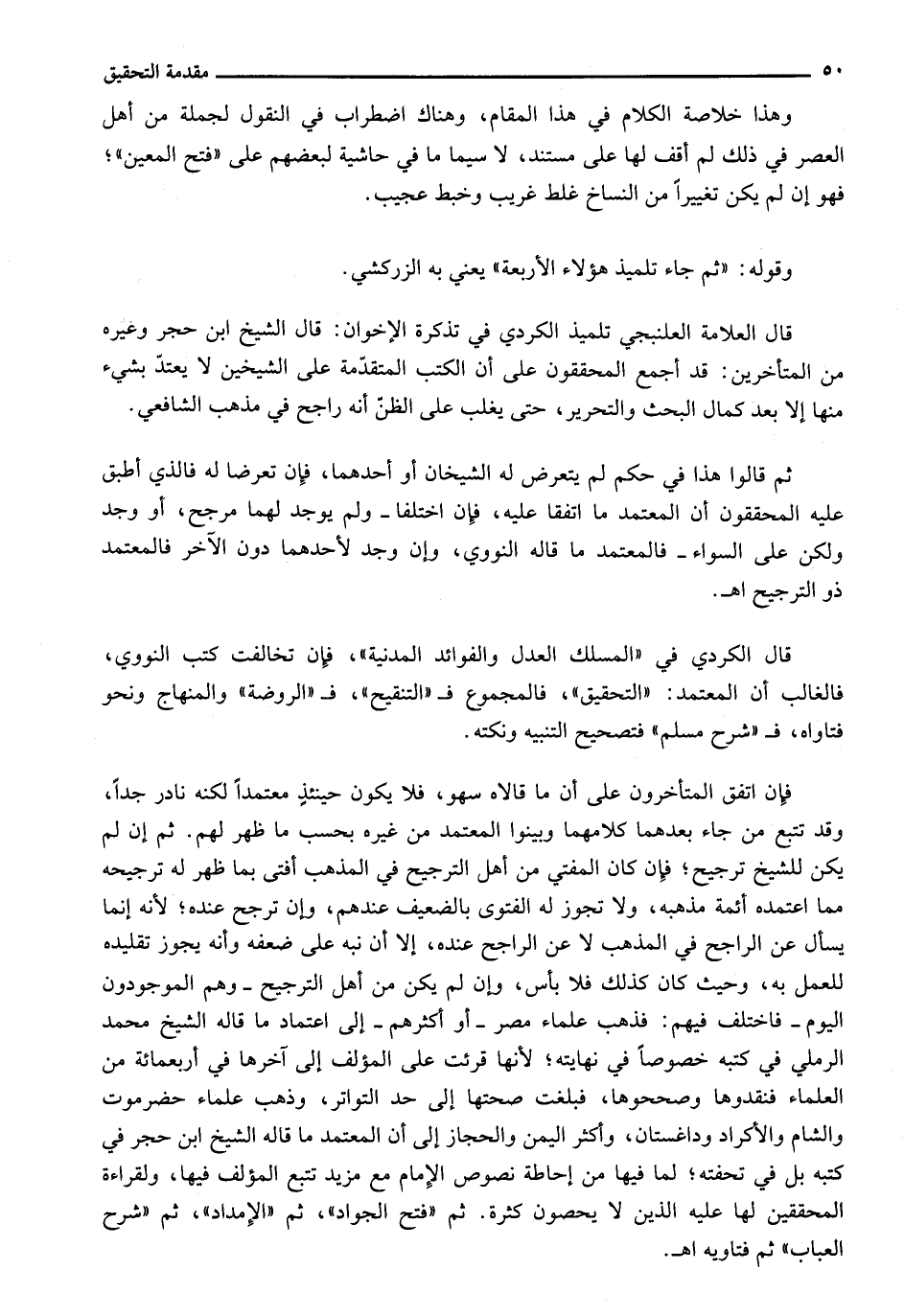 قال العلامة العلنبجي تلميذ الكردي في تذكرة الإخوان: قال الشيخ ابن حجر وغيره من المتأخرين: قد أجمع المحققون على أن الكتب المتقدمة على الشيخين لا يعتد بشيء منها إلا بعد كمال البحث والتحرير، حتى يغلب على الظن أنه راجح في مذهب الشافعي.
