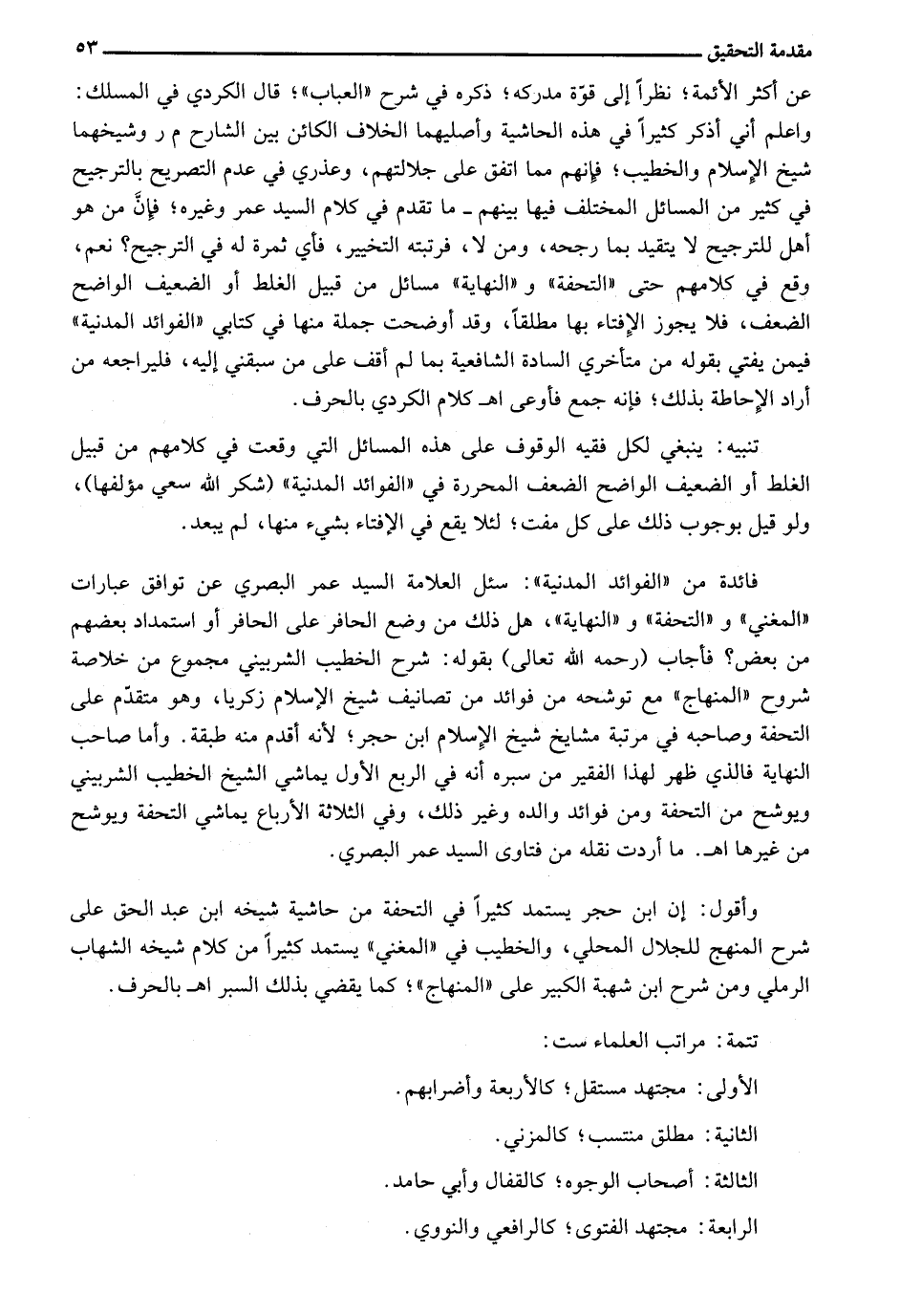 فائدة من "الفوائد المدنية": سئل العلامة السيد عمر البصري عن توافق عبارات "المغني" و"التحفة" و"النهاية"، هل ذلك من وضع الحافر على الحافر أو استمداد بعضهم من بعض؟ فأجاب (رحمه الله تعالى) بقوله: شرح الخطيب الشربيني مجموع من خلاصة شروح "المنهاج" مع توشحه من فوائد من تصانيف شيخ الإسلام زكريا، وهو متقدم على التحفة وصاحبه في مرتبة مشايخ شيخ الإسلام ابن حجر؛ لأنه أقدم منه طبقة. وأما صاحب النهاية فالذي ظهر لهذا الفقير من سبره أنه في الربع الأول يماشي الشيخ الخطيب الشربيني ويوشح من التحفة ومن فوائد والده وغير ذلك، وفي الثلاثة الأرباع يماشي التحفة ويوشح من غيرها أهـ. ما أردت نقله من فتاوى السيد عمر البصري.