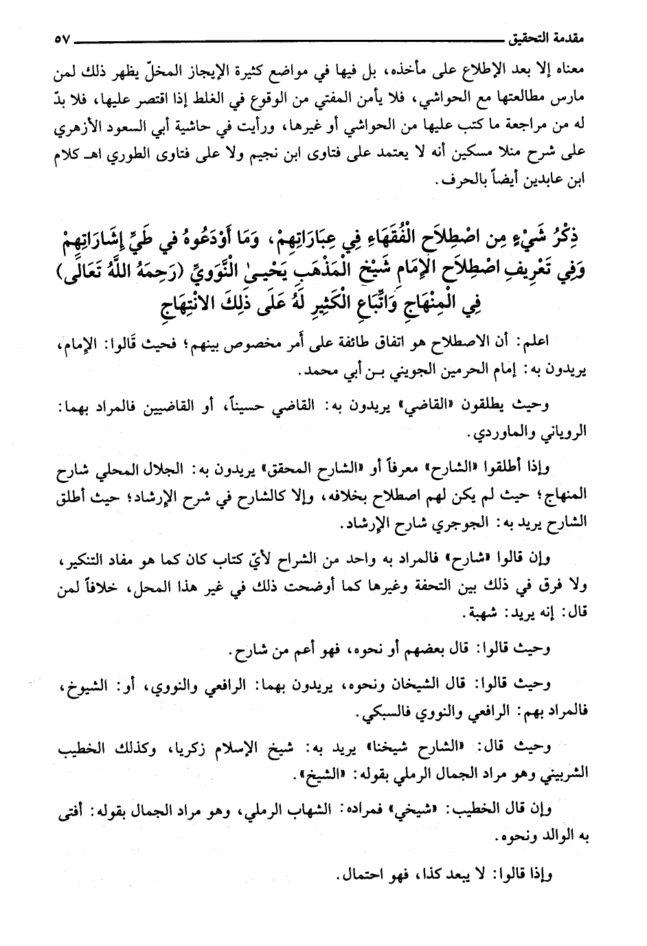 وإذا أطلقوا "الشارح" معرفاً أو "الشارح المحقق" يريدون به: الجلال المحلي شارح المنهاج؛ حيث لم يكن لهم اصطلاح بخلافه، وإلا كالشارح في شرح الإرشاد؛ حيث أطلق الشارح يريد به: الجوجري شارح الإرشاد.