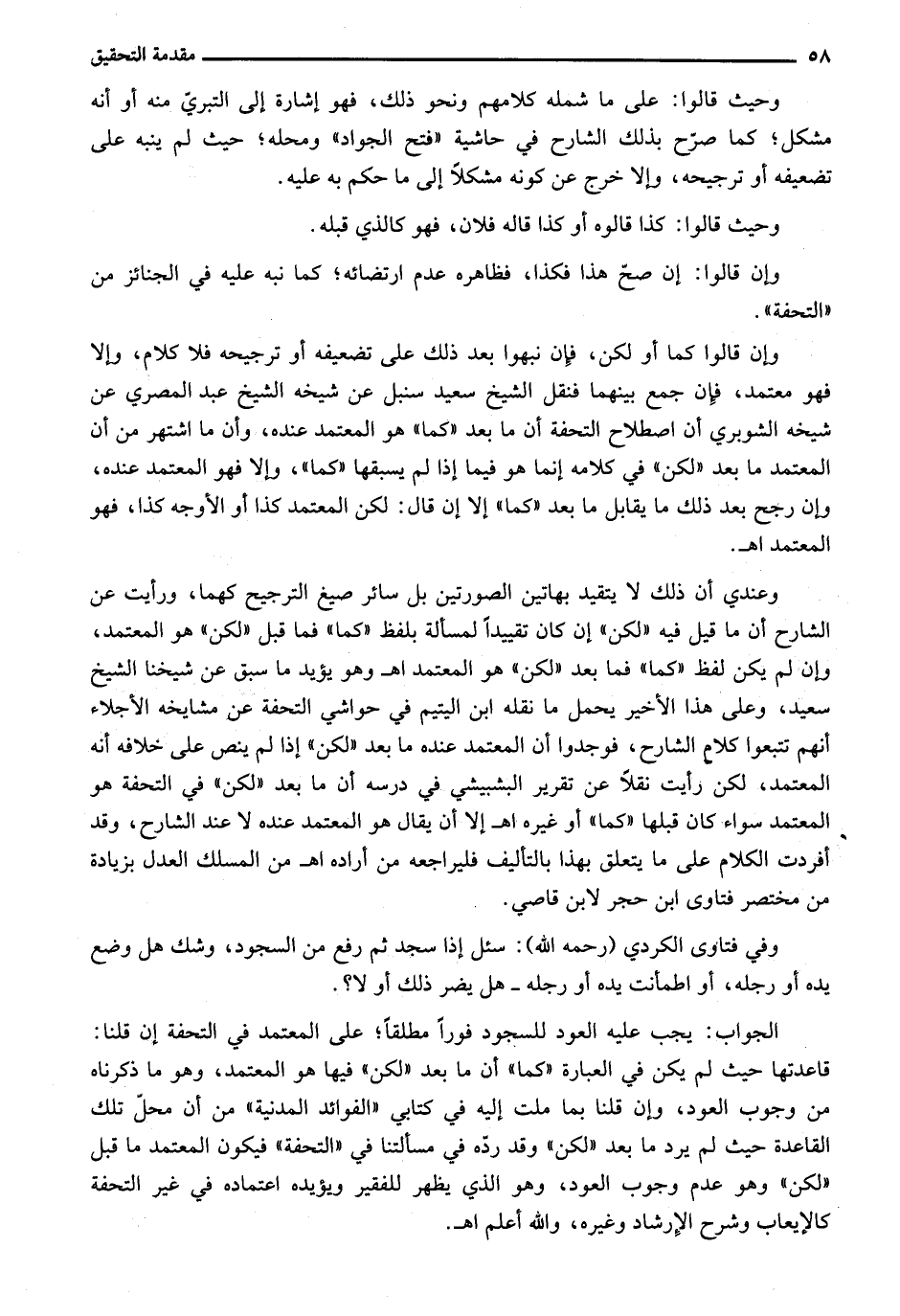 وإن قالوا كما أو لكن، فإن نبهوا بعد ذلك على تضعيفه أو ترجيحه فلا كلام، وغلا فهو معتمد، فإن جمع بينهما فنقل الشيخ سعيد سنبل عن شيخه الشيخ عبد المصري عن شيخه الشوبري أن اصطلاح التحفة أن ما بعد "كما" هو المعتمد عنده، وأن ما اشتهر من أن المعتمد ما بعد "لكن" في كلامه إنما هو فيما إذا لم يسبقها "كما"، وإلا فهو المعتمد عنده وإن رجح بعد ذلك ما يقابل ما بعد "كما" إلا إن قال: لكن المعتمد كذا أو الأوجه، فهو المعتمد أهـ.