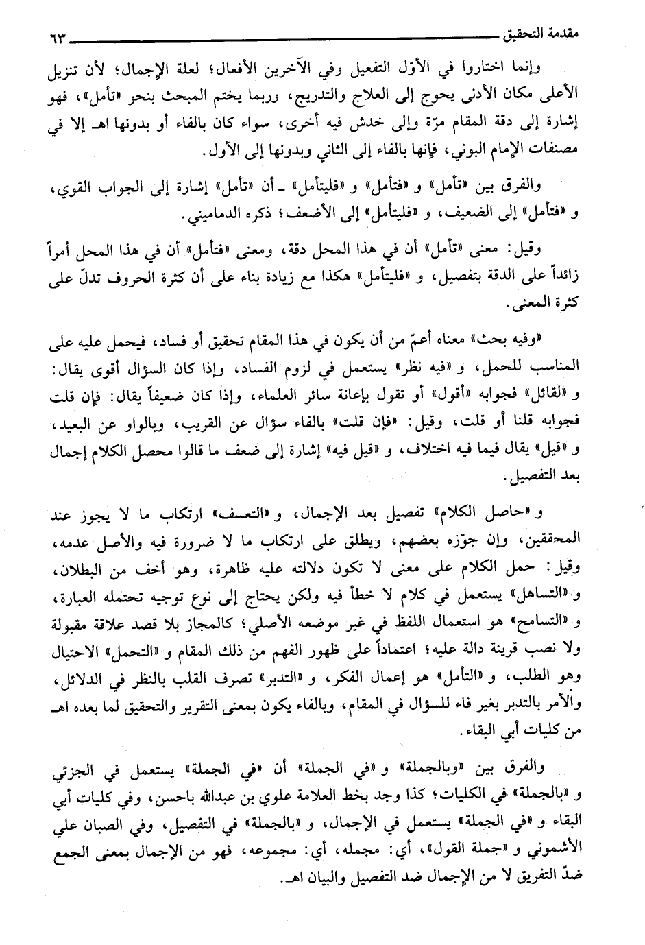 وإنما اختاروا في الأول التفعيل وفي الآخرين الأفعال؛ لعلة الإجمال؛ لأن تنزيل الأعلى مكان الأدنى يحوج إلى العلاج والتدريج، وربما يختم المبحث بنحو "تأمل"، فهو إشارة إلى دقة المقام مرة وإلى خدش فيه أخرى، سواء كان بالفاء أو بدونها أهـ إلا في مصنفات الإمام البوني، فإنها بالفاء إلى الثاني وبدونها إلى الأول.