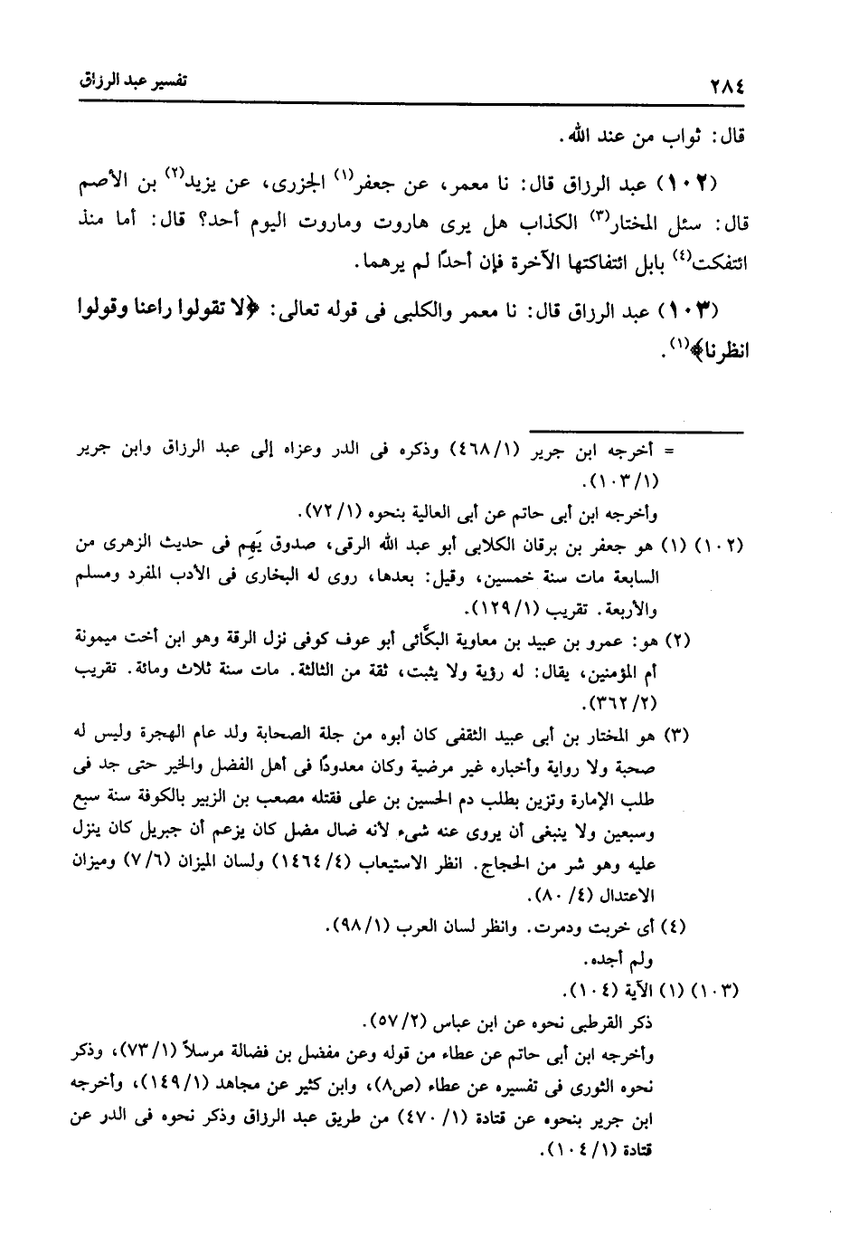 103 - نا مَعْمَرٌ , وَالْكَلْبِيُّ , فِي قَوْلِهِ تَعَالَى: {§لَا تَقُولُوا رَاعِنَا , وَقُولُوا انْظُرْنَا} [البقرة: 104]