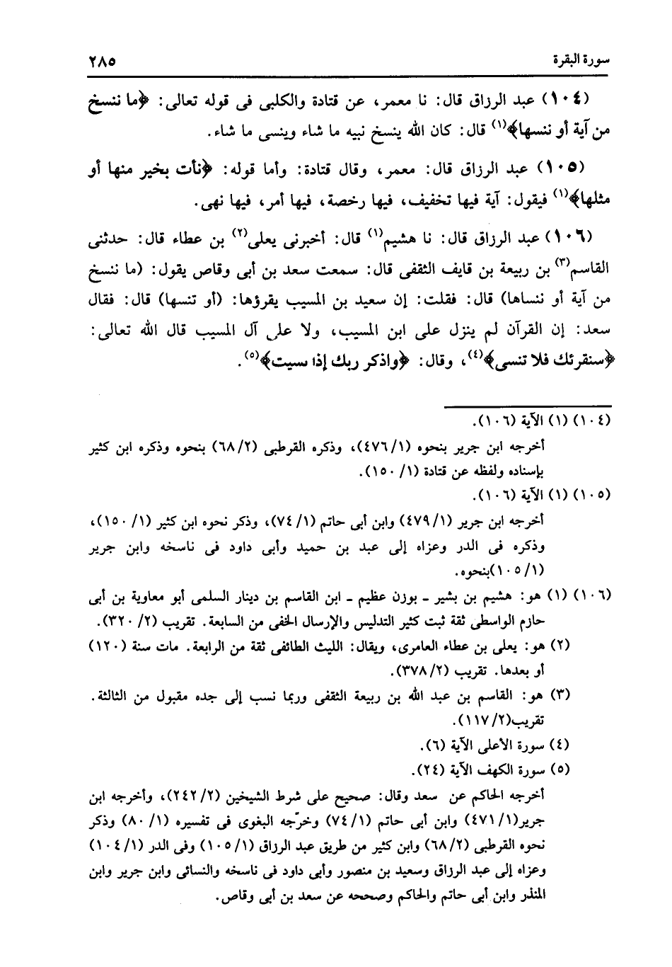 106 - نا هُشَيْمٌ , قَالَ: أَخْبَرَنِي يَعْلَى بْنُ عَطَاءٍ , قَالَ: حَدَّثَنِي الْقَاسِمُ بْنُ رَبِيعَةَ بْنِ قَايِفٍ الثَّقَفِيُّ , قَالَ: سَمِعْتُ سَعْدَ بْنَ أَبِي وَقَّاصٍ , يَقُولُ: «§مَا نَنْسَخْ مِنْ آيَةٍ أَوْ نَنْسَاهَا» قَالَ: فَقُلْتُ: إِنَّ سَعِيدَ بْنَ الْمُسَيِّبِ يَقْرَؤُهَا: «أَوْ تُنْسَهَا» , قَالَ: فَقَالَ سَعْدٌ: «إِنَّ الْقُرْآنَ لَمْ يَنْزِلْ عَلَى ابْنِ الْمُسَيِّبِ , وَلَا عَلَى آلِ الْمُسَيِّبِ» قَالَ اللَّهُ تَعَالَى: {سَنُقْرِئُكَ فَلَا تَنْسَى} , وَقَالَ: {وَاذْكُرْ رَبَّكَ إِذَا نَسِيتَ} [الكهف: 24]