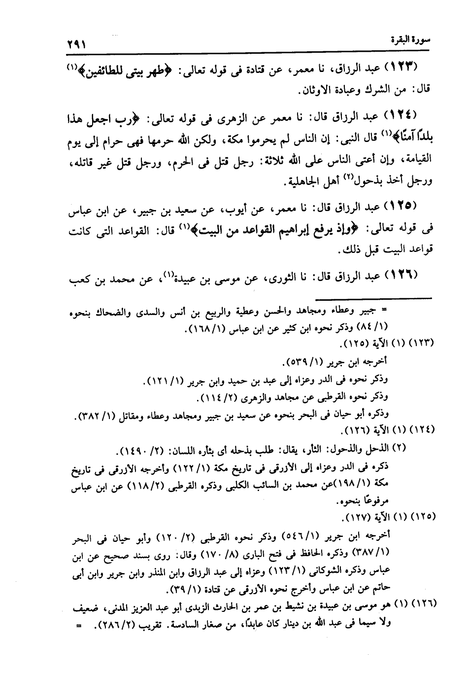 125 - نا مَعْمَرٌ , عَنْ أَيُّوبَ , عَنْ سَعِيدِ بْنِ جُبَيْرٍ , عَنِ ابْنِ عَبَّاسٍ , فِي قَوْلِهِ تَعَالَى: {§وَإِذْ يَرْفَعُ إِبْرَاهِيمُ الْقَوَاعِدَ مِنَ الْبَيْتِ} [البقرة: 127] قَالَ: «الْقَوَاعِدُ الَّتِي كَانَتْ قَوَاعِدَ الْبَيْتِ قَبْلَ ذَلِكَ»