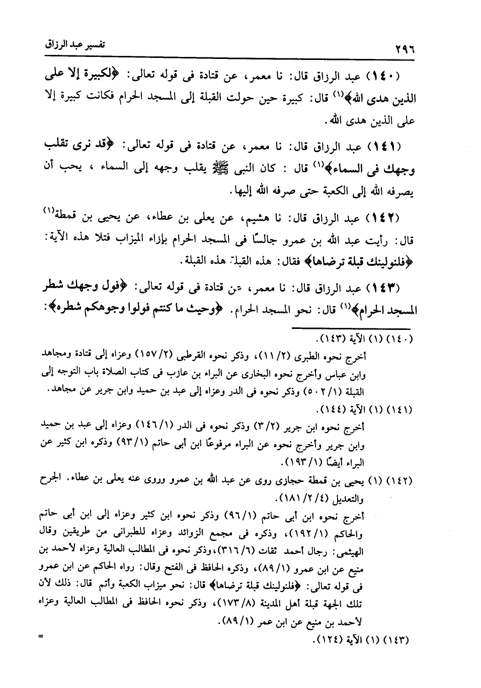 141 - نا مَعْمَرٌ , عَنْ قَتَادَةَ , فِي قَوْلِهِ تَعَالَى {§قَدْ نَرَى تَقَلُّبَ وَجْهِكَ فِي السَّمَاءِ} [البقرة: 144] قَالَ: «كَانَ النَّبِيُّ صَلَّى اللهُ عَلَيْهِ وَسَلَّمَ يُقَلِّبُ وَجْهَهُ إِلَى السَّمَاءِ , يُحِبُّ أَنْ يَصْرِفَهُ اللَّهُ إِلَى الْكَعْبَةِ , حَتَّى صَرَفَهُ اللَّهُ إِلَيْهَا»