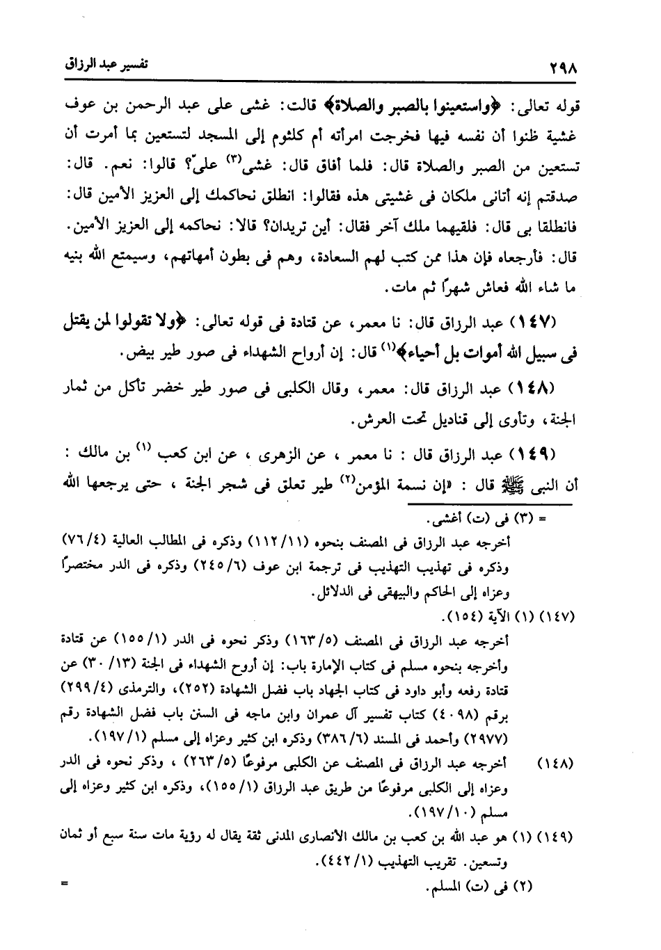 147 - نا مَعْمَرٌ , عَنْ قَتَادَةَ , فِي قَوْلِهِ تَعَالَى: {§وَلَا تَقُولُوا لِمَنْ يُقْتَلُ فِي سَبِيلِ اللَّهِ أَمْوَاتٌ بَلْ أَحْيَاءٌ} [البقرة: 154] قَالَ: «إِنَّ أَرْوَاحَ الشُّهَدَاءِ فِي صُوَرِ طَيْرٍ بِيضٍ»