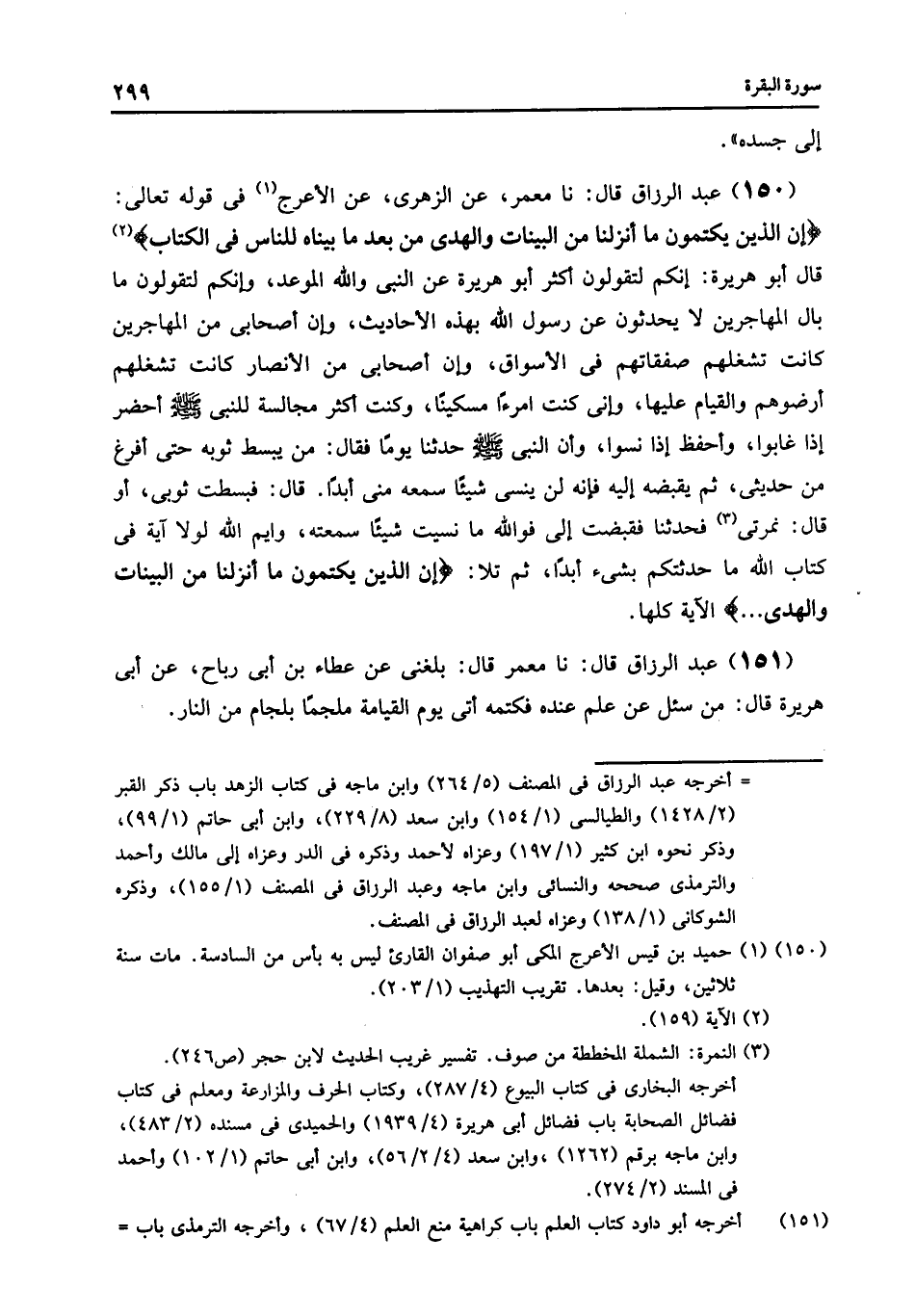 150 - نا مَعْمَرٌ , عَنِ الزُّهْرِيِّ , عَنِ الْأَعْرَجِ , فِي قَوْلِهِ تَعَالَى: {§إِنَّ الَّذِينَ يَكْتُمُونَ مَا أَنْزَلْنَا مِنَ الْبَيِّنَاتِ , وَالْهُدَى مِنْ بَعْدِ مَا بَيَّنَاهُ لِلنَّاسِ فِي الْكِتَابِ} [البقرة: 159] قَالَ أَبُو هُرَيْرَةَ: إِنَّكُمْ لَتَقُولُونَ: أَكْثَرَ أَبُو هُرَيْرَةَ عَنِ النَّبِيِّ , وَاللَّهُ الْمَوْعِدُ , وَإِنَّكُمْ لَتَقُولُونَ: مَا بَالُ الْمُهَاجِرِينَ لَا يُحَدِّثُونَ عَنْ رَسُولِ اللَّهِ بِهَذِهِ الْأَحَادِيثِ؟ وَإِنَّ أَصْحَابِي مِنَ الْمُهَاجِرِينَ كَانَتْ تَشْغَلُهُمْ صَفَقَاتُهُمْ فِي الْأَسْوَاقِ , وَإِنَّ أَصْحَابِي مِنَ الْأَنْصَارِ كَانَتْ تَشْغَلُهُمْ أَرَضُوهُمْ , وَالْقِيَامُ عَلَيْهَا , -[300]- وَإِنِّي كُنْتُ امْرَءًا مِسْكِينًا , وَكُنْتُ أُكْثِرُ مُجَالَسَةَ لِلنَّبِيِّ صَلَّى اللهُ عَلَيْهِ وَسَلَّمَ , أَحْضُرُ إِذَا غَابُوا , وَأَحْفَظُ إِذَا نَسُوا , وَأَنَّ النَّبِيَّ صَلَّى اللهُ عَلَيْهِ وَسَلَّمَ حَدَّثَنَا يَوْمًا فَقَالَ: «مَنْ يَبْسُطُ ثَوْبَهُ حَتَّى أَفْرَغَ مِنْ حَدِيثِي , ثُمَّ يَقْبِضُهُ إِلَيْهِ فَإِنَّهُ لَنْ يَنْسَى شَيْئًا سَمِعَهُ مِنِّي أَبَدًا» قَالَ: فَبَسَطْتُ ثَوْبِي أَوْ قَالَ: " نَمِرَتِي , فَحَدَّثَنَا فَقَبَضْتُ إِلَيَّ , فَوَاللَّهِ مَا نَسِيتُ شَيْئًا سَمِعْتُهُ , وَايْمُ اللَّهِ , لَوْلَا آيَةٌ فِي كِتَابِ اللَّهِ مَا حَدَّثْتُكُمْ بِشَيْءٍ أَبَدًا , ثُمَّ تَلَا: {إِنَّ الَّذِينَ يَكْتُمُونَ مَا أَنْزَلْنَا مِنَ الْبَيِّنَاتِ وَالْهُدَى} [البقرة: 159] . . . . الْآيَةَ كُلَّهَا
