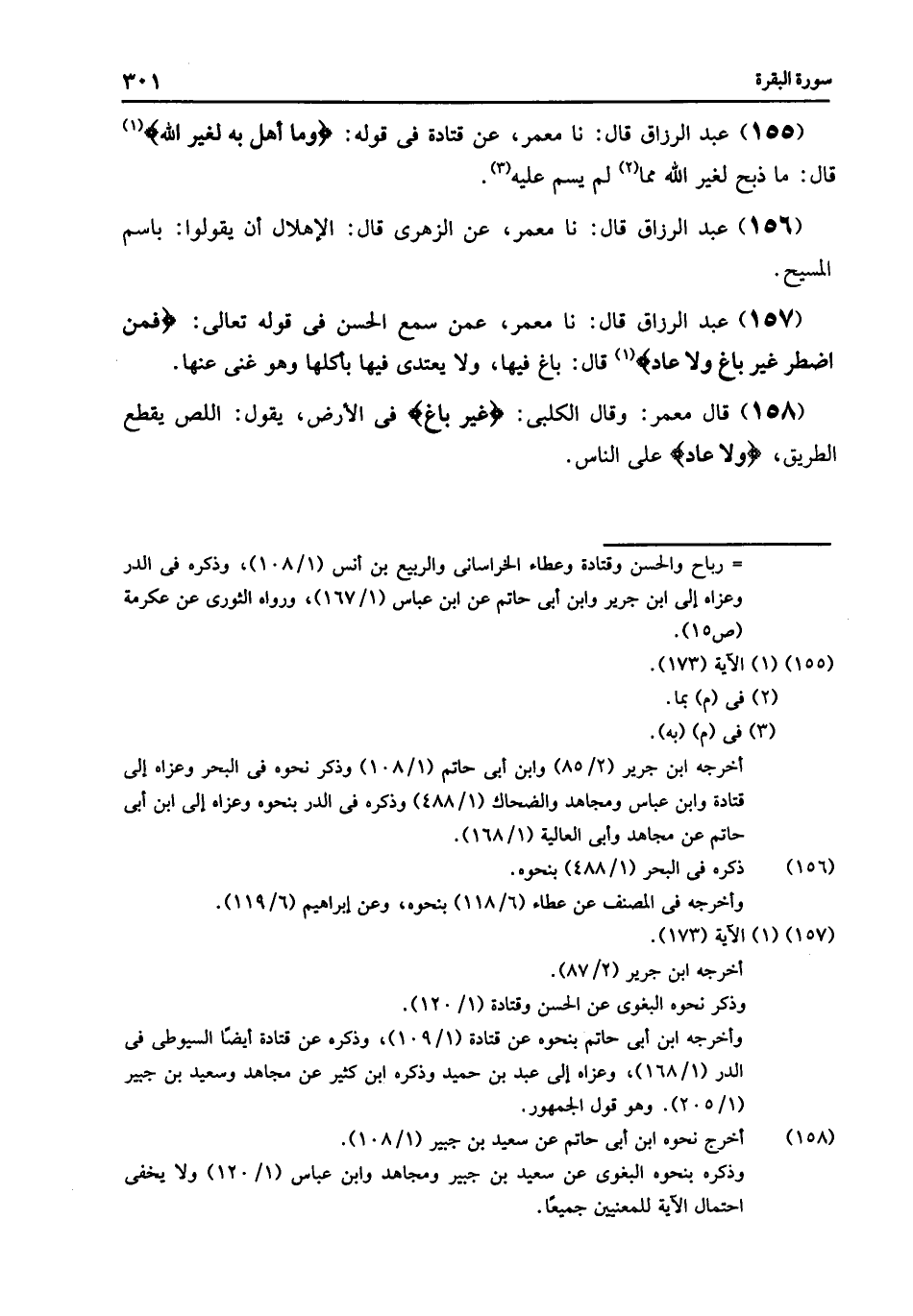 155 - نا مَعْمَرٌ , عَنْ قَتَادَةَ , فِي قَوْلِهِ: {§وَمَا أُهِلَّ بِهِ لِغَيْرِ اللَّهِ} [البقرة: 173] قَالَ: «مَا ذُبِحَ لِغَيْرِ اللَّهِ , مِمَّا لَمْ يُسَمَّ عَلَيْهِ»