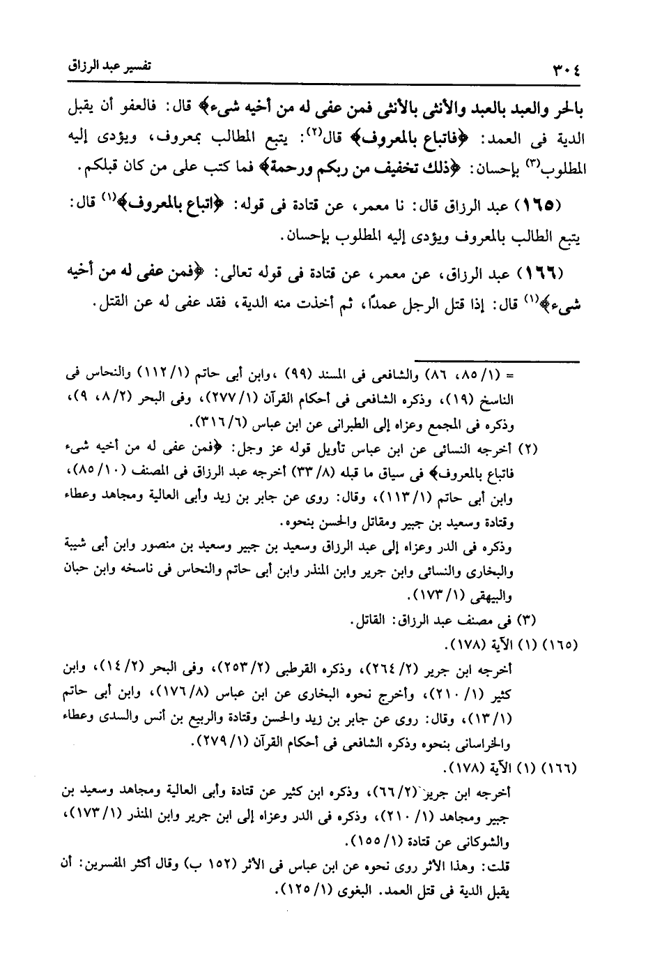 166 - عَنْ مَعْمَرٌ , عَنْ قَتَادَةَ , فِي قَوْلِهِ تَعَالَى: {§فَمَنْ عُفِيَ لَهُ مِنْ أَخِيهِ شَيْءٌ} [البقرة: 178] قَالَ: «إِذَا قَتَلَ الرَّجُلُ عَمْدًا , ثُمَّ أُخِذَتْ مِنْهُ الدِّيَةُ , فَقَدْ عُفِيَ لَهُ عَنِ الْقَتْلِ»