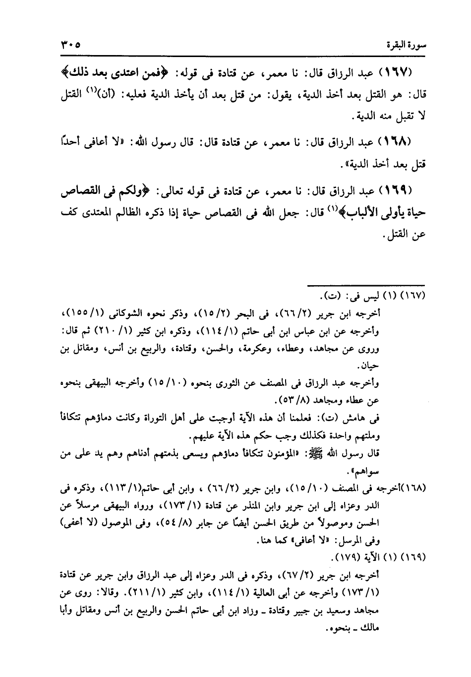169 - نا مَعْمَرٌ , عَنْ قَتَادَةَ , فِي قَوْلِهِ تَعَالَى: {§وَلَكُمْ فِي الْقِصَاصِ} [البقرة: 179] حَيَاةٌ يَا أُولِي الْأَلْبَابِ قَالَ: «جَعَلَ اللَّهُ فِي الْقِصَاصِ حَيَاةً , إِذَا ذَكَرَهُ الظَّالِمُ الْمُعْتَدِي كَفَّ عَنِ الْقَتْلِ»