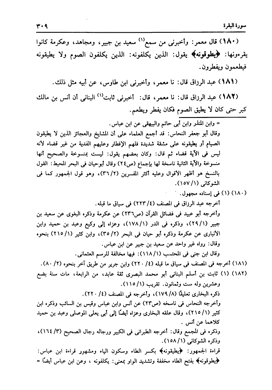 180 - قَالَ مَعْمَرٌ: وَأَخْبَرَنِي مَنْ سَمِعَ سَعِيدَ بْنَ جُبَيْرٍ , وَمُجَاهِدًا , وَعِكْرِمَةَ كَانُوا يَقْرَءُونَهَا: " {§يُطَوَّقُونَهُ} يَقُولُ: «الَّذِينَ يُكَلَّفُونَهُ , الَّذِينَ يُكَلَّفُونَ الصَّوْمَ وَلَا يُطِيقُونَهُ , فَيُطْعِمُونَ , وَيُفْطِرُونَ» , عَبْدُ الرَّزَّاقِ قَالَ: