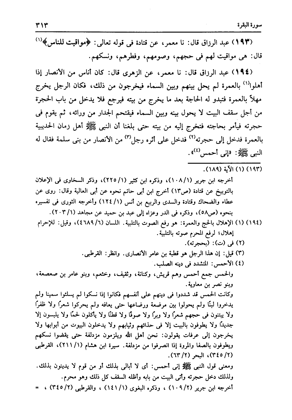 194 - نا مَعْمَرٌ , عَنِ الزُّهْرِيِّ , قَالَ: «§كَانَ أُنَاسٌ مِنَ الْأَنْصَارِ إِذَا أَهَلُّوا بِالْعُمْرَةِ لَمْ يَحُلْ بَيْنَهُمْ وَبَيْنَ السَّمَاءِ فَيَخْرُجُونَ مِنْ ذَلِكَ , فَكَانَ الرَّجُلُ يَخْرُجُ مُهِلًّا بِالْعُمْرَةِ , فَتَبْدُو لَهُ الْحَاجَةُ بَعْدَمَا يَخْرُجُ مِنْ بَيْتِهِ , فَيَرْجِعُ فَلَا يَدْخُلُ مِنْ بَابِ الْحُجْرَةِ مِنْ أَجْلِ سَقْفِ الْبَيْتِ لَا يَحُولُ بَيْنَهُ وَبَيْنَ السَّمَاءِ , فَيَقْتَحِمُ الْجِدَارَ مِنْ وَرَائِهِ , ثُمَّ يَقُومُ فِي حُجْرَتِهِ فَيَأْمُرُ بِحَاجَتِهِ فَتُخْرَجُ إِلَيْهِ مِنْ بَيْتِهِ» حَتَّى بَلَغَنَا أَنَّ النَّبِيَّ صَلَّى اللهُ عَلَيْهِ وَسَلَّمَ أَهَلَّ زَمَانَ الْحُدَيْبِيَةِ بِالْعُمْرَةِ , فَدَخَلَ إِلَى حُجْرَتِهِ , فَدَخَلَ عَلَى أَثَرِهِ رَجُلٌ مِنَ الْأَنْصَارِ مِنْ بَنِي سَلِمَةَ , فَقَالَ لَهُ النَّبِيُّ صَلَّى اللهُ عَلَيْهِ وَسَلَّمَ: «إِنِّي أَحْمَسُ»