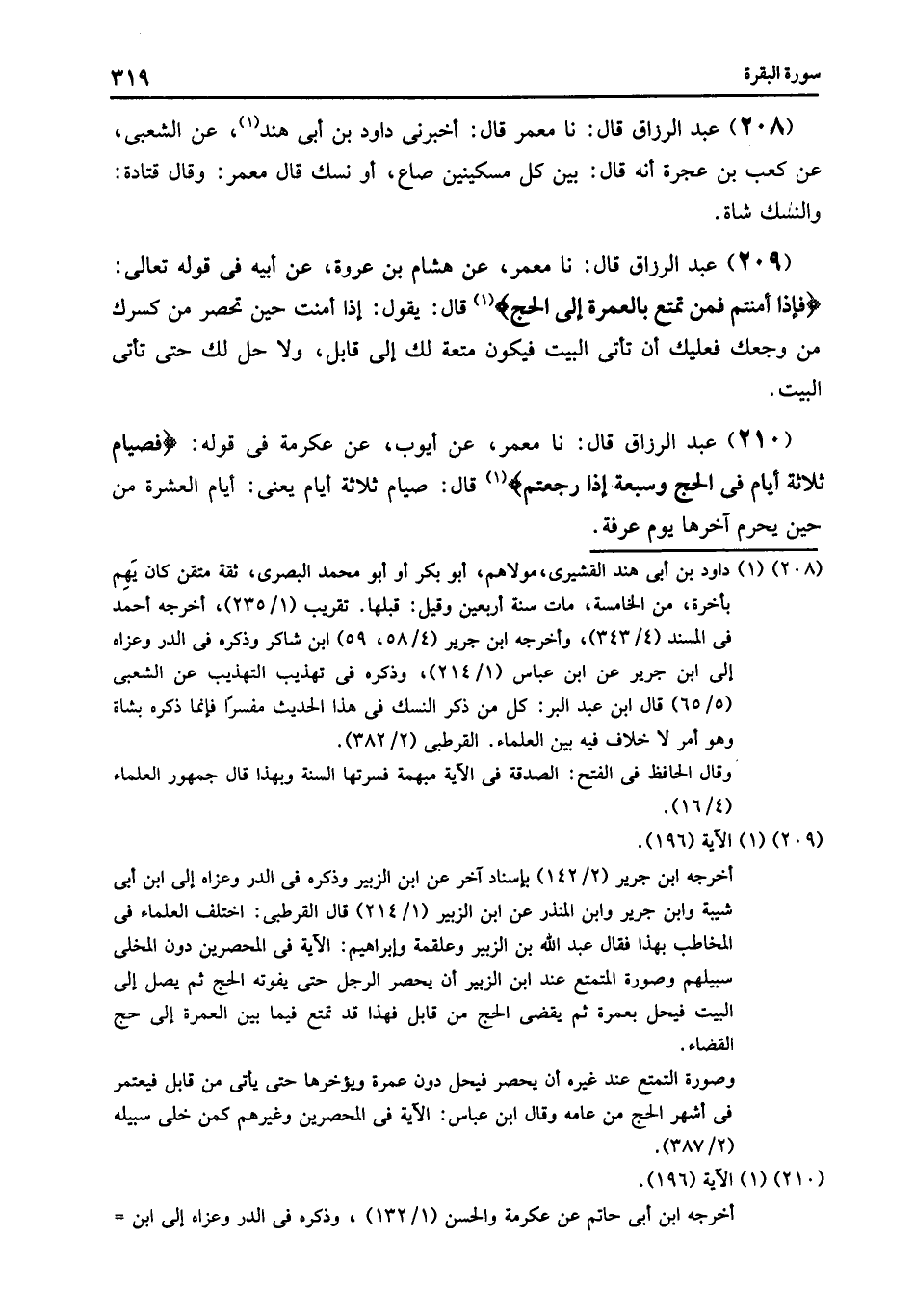 210 - نا مَعْمَرٌ , عَنْ أَيُّوبَ , عَنْ عِكْرِمَةَ , فِي قَوْلِهِ: {§فَصِيَامُ ثَلَاثَةِ أَيَّامٍ فِي الْحَجِّ وَسَبْعَةٍ إِذَا رَجَعْتُمْ} [البقرة: 196] قَالَ: «صِيَامُ ثَلَاثَةِ أَيَّامٍ , يَعْنِي أَيَّامَ الْعَشْرِ , مِنْ حِينَ يُحْرِمُ , آخِرُهَا يَوْمُ عَرَفَةَ»