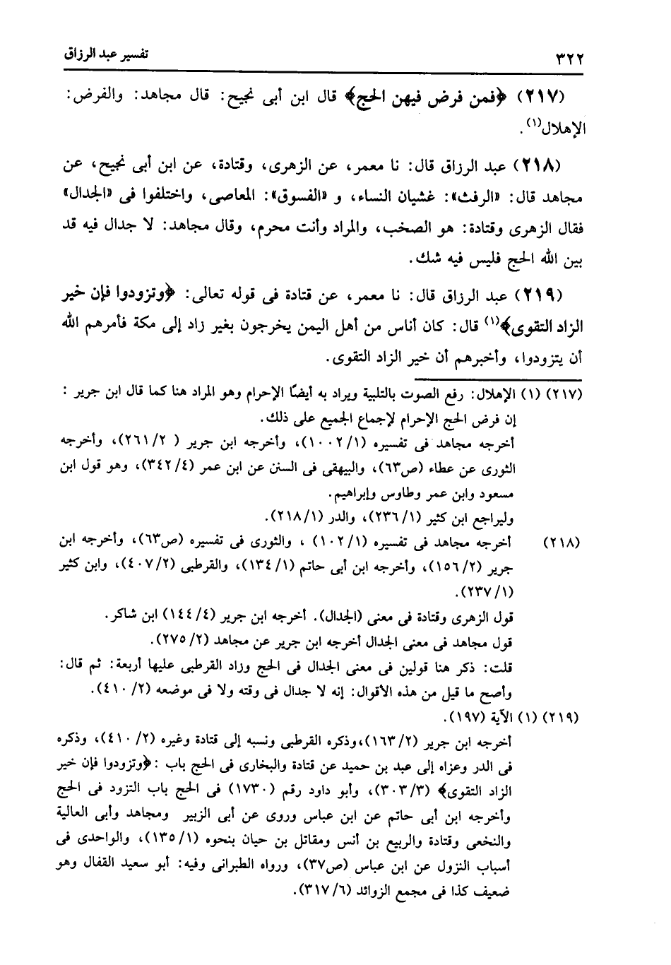218 - نا مَعْمَرٌ , عَنِ الزُّهْرِيِّ , وَقَتَادَةُ , عَنِ ابْنِ أَبِي نَجِيحٍ , عَنْ مُجَاهِدٍ , قَالَ: " §الرَّفَثُ: غَشَيَانُ النِّسَاءِ , وَالْفُسُوقُ: الْمَعَاصِي , وَاخْتَلَفُوا فِي الْجِدَالِ " فَقَالَ الزُّهْرِيُّ , وَقَتَادَةُ: «هُوَ الصَّخَبُ , وَالْمُرَادُ وَأَنْتَ مُحْرِمٌ» وَقَالَ مُجَاهِدٌ: «لَا جِدَالَ فِيهِ , قَدْ بَيَّنَ اللَّهُ الْحَجَّ , فَلَيْسَ فِيهِ شَكٌّ»