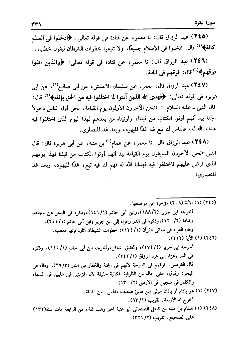 246 - نا مَعْمَرٌ , عَنْ قَتَادَةَ , فِي قَوْلِهِ تَعَالَى: {§وَالَّذِينَ اتَّقَوْا فَوْقَهُمْ} [البقرة: 212] قَالَ: «فَوْقَهُمْ فِي الْجَنَّةِ»