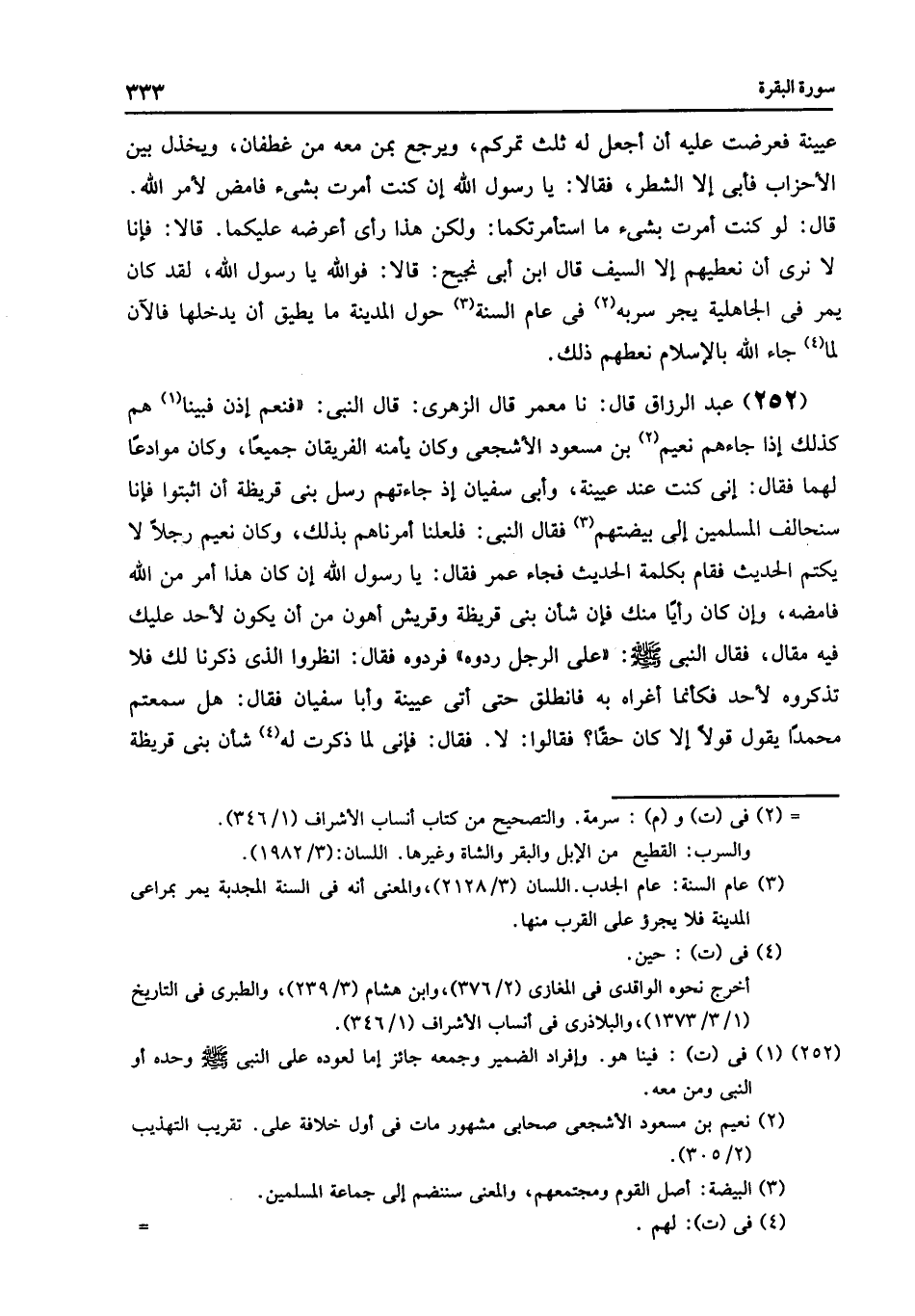 251 - عَبْدُ الرَّزَّاقِ قَالَ: نا مَعْمَرٌ , عَنِ الزُّهْرِيِّ , قَالَ: لَمَّا كَانَ يَوْمُ الْأَحْزَابِ حُصِرَ النَّبِيُّ صَلَّى اللهُ عَلَيْهِ وَسَلَّمَ بِضْعَ عَشْرَةَ لَيْلَةً , حَتَّى خَلَصَ إِلَى كُلِّ امْرِئٍ مِنْهُمُ الْكَرْبُ , وَحَتَّى قَالَ النَّبِيُّ كَمَا قَالَ ابْنُ الْمُسَيِّبِ: «§اللَّهُمَّ أَنْشُدُكَ عَهْدَكَ وَوَعْدَكَ , اللَّهُمَّ إِنَّكَ إِنْ تَشَأْ لَا تُعْبَدُ» فَبَيْنَا هُمْ كَذَلِكَ , أَرْسَلَ النَّبِيُّ إِلَى عُيَيْنَةَ بْنِ حِصْنِ بْنِ بَدْرٍ: «أَرَأَيْتَ إِنْ جَعَلْتُ لَكَ ثُلُثَ تَمْرِ الْأَنْصَارِ , أَتَرْجِعُ بِمَنْ مَعَكَ مِنْ غَطَفَانَ , وَتُخَذِّلُ بَيْنَ الْأَحْزَابِ؟» فَأَرْسَلَ إِلَيْهِ عُيَيْنَةُ: " إِنْ جَعَلْتَ لِيَ الشَّطْرَ فَعَلْتُ , فَأَرْسَلَ النَّبِيُّ إِلَى سَعْدِ بْنِ عُبَادَةَ , وَسَعْدِ بْنِ مُعَاذٍ فَقَالَ: «إِنِّي أَرْسَلْتُ إِلَى عُيَيْنَةَ فَعَرَضْتُ عَلَيْهِ أَنْ أَجْعَلَ لَهُ ثُلُثَ تَمْرِكُمْ , وَيَرْجِعَ بِمَنْ مَعَهُ مِنْ غَطَفَانَ , وَيُخَذِّلَ بَيْنَ الْأَحْزَابِ , فَأَبَى إِلَّا الشَّطْرَ» فَقَالَا: يَا رَسُولَ اللَّهِ «إِنْ كُنْتَ أُمِرْتَ بِشَيْءٍ فَامْضِ لِأَمْرِ اللَّهِ» قَالَ: «لَوْ كُنْتُ أُمِرْتُ بِشَيْءٍ مَا اسْتَأْمَرْتُكُمَا , وَلَكِنَّ هَذَا رَأْيٌ أَعْرِضُهُ عَلَيْكُمَا» قَالَا: «فَإِنَّا لَا نَرَى أَنْ نُعْطِيَهُمْ إِلَّا السَّيْفَ» قَالَ ابْنُ أَبِي نَجِيحٍ: قَالَا: فَوَاللَّهِ يَا رَسُولَ اللَّهِ «لَقَدْ كَانَ يَمُرُّ فِي الْجَاهِلِيَّةِ يَجُرُّ سِرْبَهُ فِي عَامِ السَّنَةِ حَوْلَ الْمَدِينَةِ , مَا يُطِيقُ أَنْ يَدْخُلَهَا , فَالْآنَ لَمَّا جَاءَ اللَّهُ بِالْإِسْلَامِ نُعْطِيهِمْ ذَلِكَ؟»