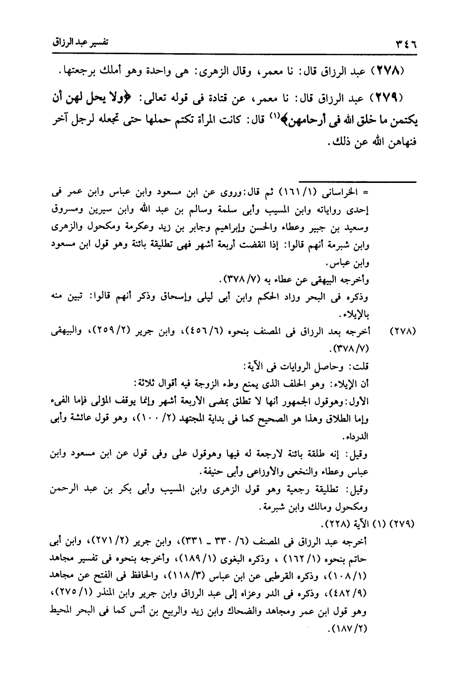 277 - نا مَعْمَرٌ , عَنْ قَتَادَةَ , عَنْ عَلِيِّ بْنِ أَبِي طَالِبٍ , وَعَنْ عَطَاءٍ الْخُرَاسَانِيِّ , عَنْ أَبِي سَلَمَةَ بْنِ عَبْدِ الرَّحْمَنِ , عَنْ عُثْمَانَ , وَزَيْدٍ , أَنَّهُمْ قَالُوا فِي قَوْلِهِ تَعَالَى: {§لِلَّذِينَ يُؤْلُونَ مِنْ نِسَائِهِمْ تَرَبُّصُ أَرْبَعَةِ أَشْهُرٍ} [البقرة: 226] قَالُوا: «الْإِيلَاءُ تَطْلِيقَةٌ , وَهِيَ أَمْلَكُ بِنَفْسِهَا , وَعَلَيْهَا الْعِدَّةُ لِغَيْرِهَا»