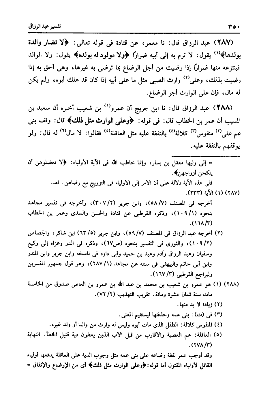 288 - نا ابْنُ جُرَيْجٍ , أَنَّ عَمْرَو بْنَ شُعَيْبٍ , أَخْبَرَهُ أَنَّ سَعِيدَ بْنَ الْمُسَيِّبِ , أَنَّ عُمَرَ بْنَ الْخَطَّابِ قَالَ فِي قَوْلِهِ: {§وَعَلَى الْوَارِثِ مِثْلُ ذَلِكَ} [البقرة: 233] قَالَ: وَقْفُ بَنِي عَمٍّ عَلَى مَنْفُوسٍ كَلَالَةٍ بِالنَّفَقَةِ عَلَيْهِ مِثْلُ الْعَاقِلَةِ , فَقَالُوا: «لَا مَالَ لَهُ» قَالَ: «وَلَوْ يُوَقِّفُهُمْ بِالنَّفَقَةِ عَلَيْهِ»