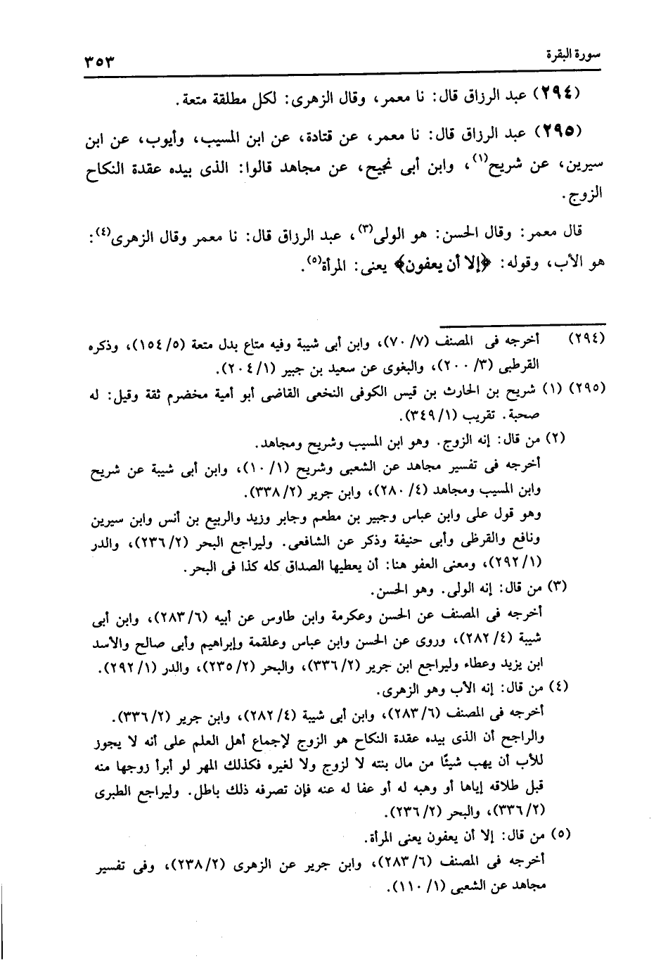 295 - نا مَعْمَرٌ , عَنْ قَتَادَةَ , عَنِ ابْنِ الْمُسَيِّبِ , وَأَيُّوبُ , عَنِ ابْنِ سِيرِينَ , عَنْ شُرَيْحٍ , وَابْنُ أَبِي نَجِيحٍ , عَنْ مُجَاهِدٍ , قَالُوا: {§الَّذِي بِيَدِهِ عُقْدَةُ} [البقرة: 237] النِّكَاحِ الزَّوْجُ قَالَ مَعْمَرٌ: وَقَالَ الْحَسَنُ: «هُوَ الْوَلِيُّ» عَبْدُ الرَّزَّاقِ قَالَ: نا مَعْمَرٌ , وَقَالَ الزُّهْرِيُّ: «هُوَ الْأَبُ» وَقَوْلُهُ: {إِلَّا أَنْ يَعْفُونَ} [البقرة: 237] يَعْنِي: الْمَرْأَةَ "