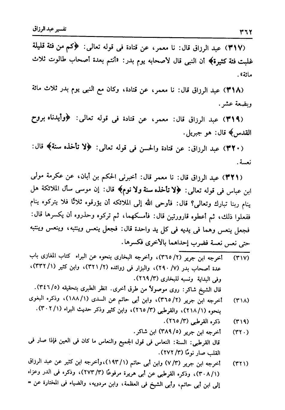 320 - عَنْ قَتَادَةَ , وَالْحَسَنِ , فِي قَوْلِهِ تَعَالَى: {§لَا تَأْخُذُهُ سِنَةٌ} [البقرة: 255] قَالَ: «نَعْسَةٌ»