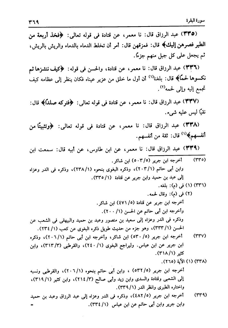 335 - نا مَعْمَرٌ , عَنْ قَتَادَةَ , فِي قَوْلِهِ تَعَالَى: {§فَخُذْ أَرْبَعَةً مِنَ الطَّيْرِ فَصُرْهُنَّ إِلَيْكَ} [البقرة: 260] قَالَ: «فَمَزَّقَهُنَّ» قَالَ: «أُمِرَ أَنْ تُخْلَطَ الدِّمَاءُ بِالدِّمَاءِ , وَالرِّيشُ بِالرِّيشِ , ثُمَّ يَجْعَلَ عَلَى كُلِّ جَبَلٍ مِنْهُنَّ جُزْءًا»
