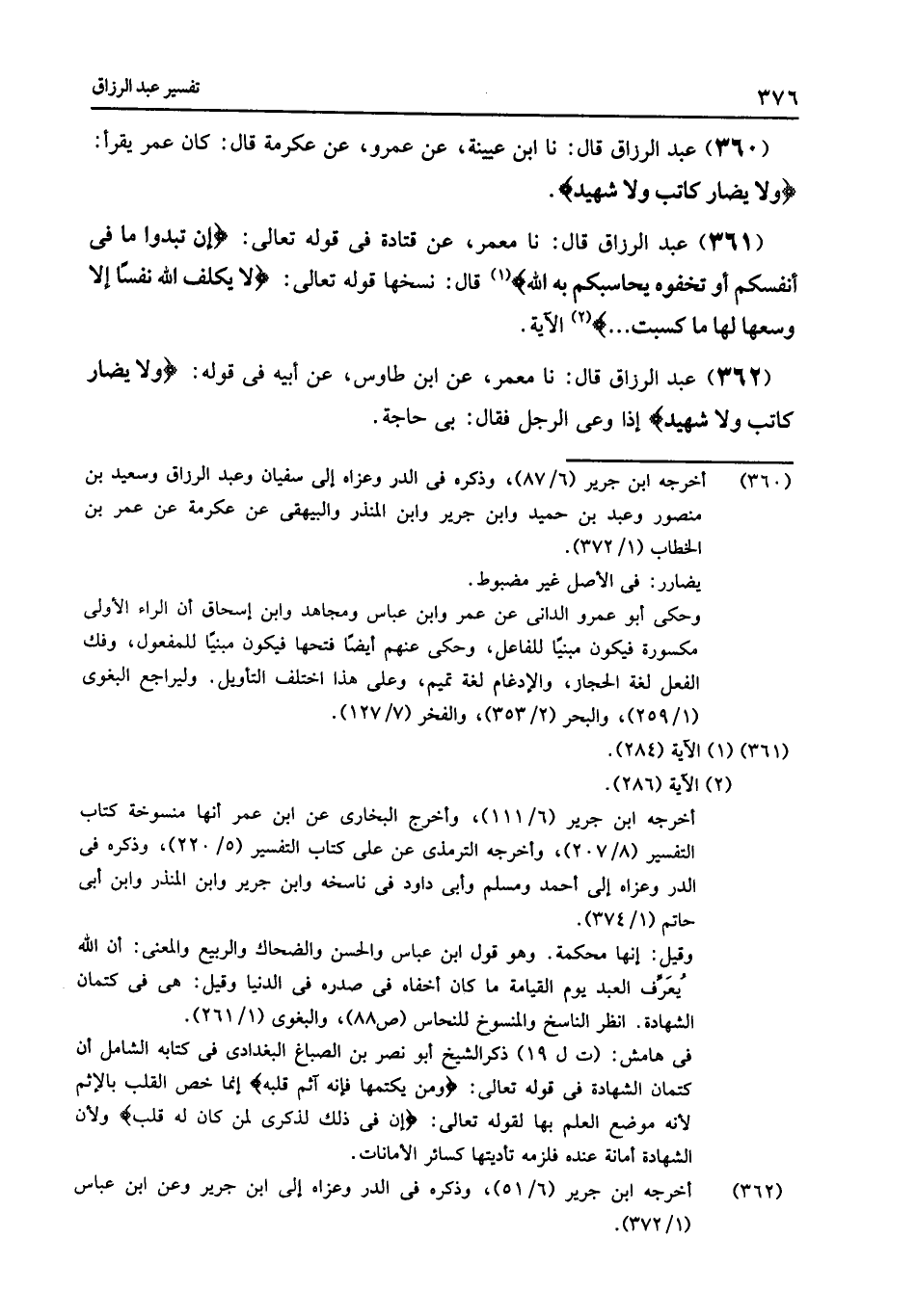 359 - نا ابْنُ جُرَيْجٍ , عَنْ عَطَاءٍ , فِي قَوْلِهِ تَعَالَى: {§وَلَا يُضَارَّ كَاتِبٌ وَلَا شَهِيدٌ} [البقرة: 282] يَقُولُ: «أَنْ يُؤَدِّيَا مَا قِبَلَهُمَا»