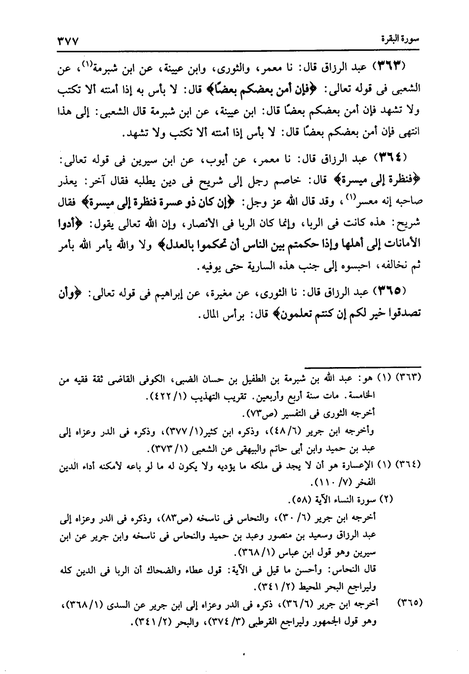 363 - نا مَعْمَرٌ , وَالثَّوْرِيُّ , وَابْنُ عُيَيْنَةَ , عَنِ ابْنِ شُبْرُمَةَ , عَنِ الشَّعْبِيِّ , فِي قَوْلِهِ تَعَالَى: {§فَإِنْ أَمِنَ بَعْضُكُمْ بَعْضًا} [البقرة: 283] قَالَ: " لَا بَأْسَ بِهِ إِذَا أَمِنْتَهُ أَلَّا تَكْتُبَ , وَلَا تُشْهِدَ {فَإِنْ أَمِنَ بَعْضُكُمْ بَعْضًا} [البقرة: 283] قَالَ ابْنُ عُيَيْنَةَ , عَنِ ابْنِ شُبْرُمَةَ قَالَ الشَّعْبِيُّ: إِلَى هَذَا انْتَهَى: {فَإِنْ أَمِنَ بَعْضُكُمْ بَعْضًا} [البقرة: 283] قَالَ: «لَا بَأْسَ إِذَا أَمِنْتَهُ أَلَّا تَكْتُبَ , وَلَا تُشْهِدَ»