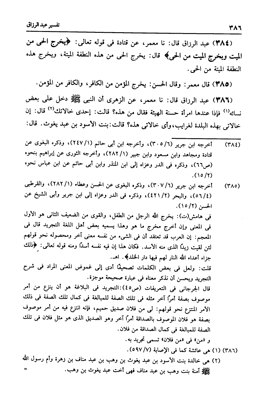 386 - نا مَعْمَرٌ , عَنِ الزُّهْرِيِّ , أَنَّ النَّبِيَّ صَلَّى اللهُ عَلَيْهِ وَسَلَّمَ §دَخَلَ عَلَى بَعْضِ نِسَائِهِ , فَإِذَا عِنْدَهَا امْرَأَةٌ حَسَنَةُ الْهَيْئَةِ , فَقَالَ: «مَنْ هَذِهِ؟» قَالَتْ: إِحْدَى خَالَاتِكَ , قَالَ: «إِنَّ خَالَاتِي بِهَذِهِ الْبَلْدَةِ لَغَرَايِبُ , وَأَيُّ خَالَاتِي هَذِهِ؟» قَالَتْ: بِنْتُ الْأَسْوَدِ بْنِ عَبْدِ يَغُوثَ , قَالَ: «سُبْحَانَ اللَّهِ الَّذِي يُخْرِجُ الْحَيَّ مِنَ الْمَيِّتِ , وَكَانَتِ امْرَأَةً صَالِحَةً , وَكَانَ أَبُوهَا كَافِرًا»