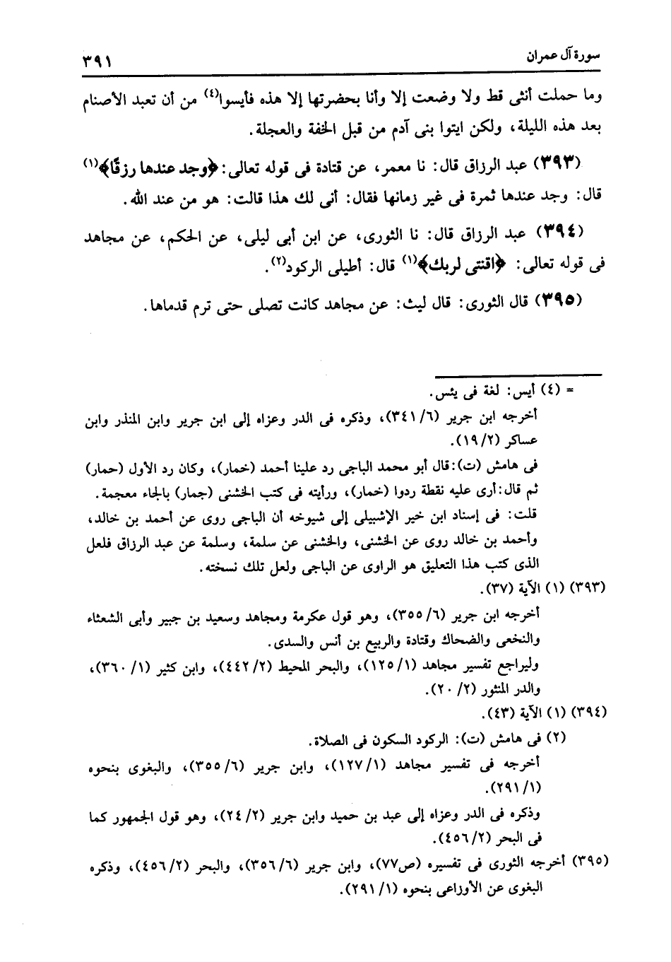 394 - نا الثَّوْرِيُّ , عَنِ ابْنِ أَبِي لَيْلَى , عَنِ الْحَكَمِ , عَنْ مُجَاهِدٍ , فِي قَوْلِهِ تَعَالَى: {§اقْنُتِي لِرَبِّكِ} [آل عمران: 43] قَالَ: «أَطِيلِي الرُّكُودَ»
