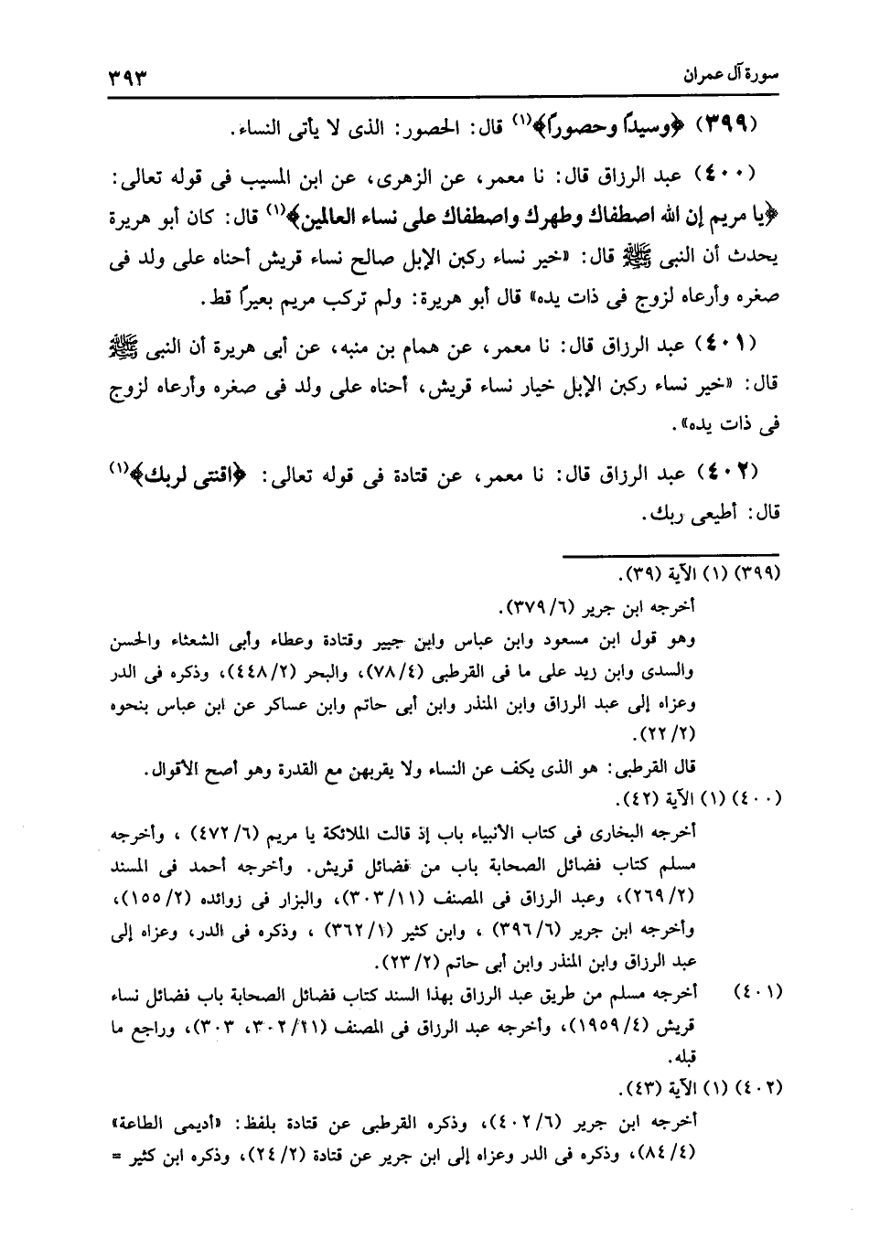 400 - نا مَعْمَرٌ , عَنِ الزُّهْرِيِّ , عَنِ ابْنِ الْمُسَيِّبِ , فِي قَوْلِهِ تَعَالَى: {§يَا مَرْيَمُ إِنَّ اللَّهَ اصْطَفَاكِ وَطَهَّرَكِ , وَاصْطَفَاكِ عَلَى نِسَاءِ الْعَالَمِينَ} [آل عمران: 42] قَالَ: كَانَ أَبُو هُرَيْرَةَ يُحَدِّثُ أَنَّ النَّبِيَّ صَلَّى اللهُ عَلَيْهِ وَسَلَّمَ قَالَ: «خَيْرُ نِسَاءٍ رَكِبْنَ الْإِبِلَ صَالِحُ نِسَاءِ قُرَيْشٍ , أَحْنَاهُ عَلَى وَلَدٍ فِي صِغَرِهِ , وَأَرْعَاهُ لِزَوْجٍ فِي ذَاتِ يَدِهِ» قَالَ أَبُو هُرَيْرَةَ: «وَلَمْ تَرْكَبْ مَرْيَمُ بَعِيرًا قَطُّ»