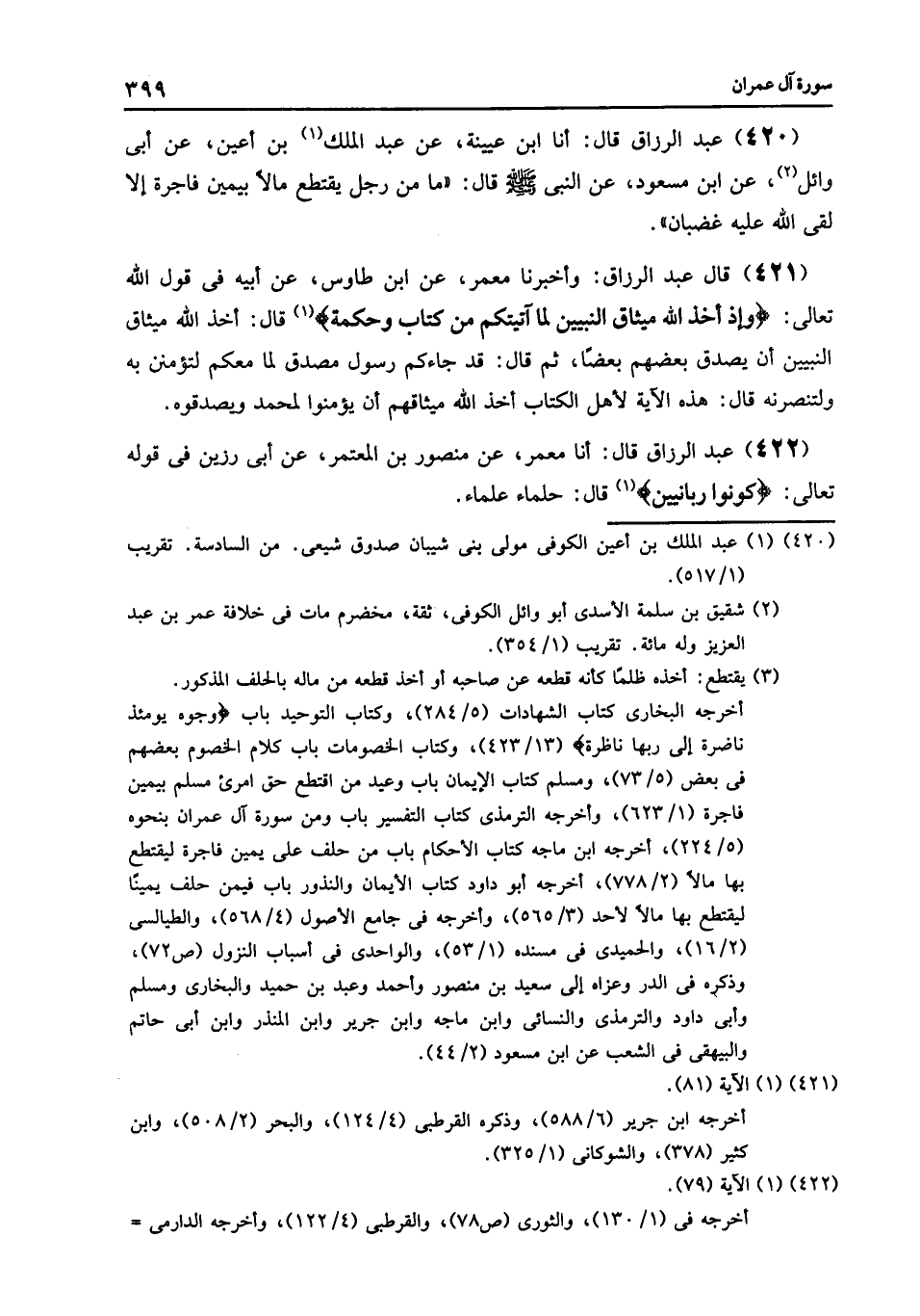 419 - عَبْدُ الرَّزَّاقِ قَالَ: أرنا مَعْمَرٌ , عَنِ الزُّهْرِيِّ , عَنِ ابْنِ الْمُسَيِّبِ , فِي قَوْلِهِ تَعَالَى: {§إِنَّ الَّذِينَ يَشْتَرُونَ بِعَهْدِ اللَّهِ وَأَيْمَانِهِمْ ثَمَنًا قَلِيلًا} [آل عمران: 77] قَالَ: هِيَ الْيَمِينُ الْفَاجِرَةُ , يَقْتَطِعُ بِهَا الرَّجُلُ مَالَ أَخِيهِ , وَالْيَمِينُ الْفَاجِرَةُ مِنَ الْكَبَائِرِ , وَتَلَا ابْنُ الْمُسَيِّبِ: {إِنَّ الَّذِينَ يَشْتَرُونَ بِعَهْدِ اللَّهِ وَأَيْمَانِهِمْ} [آل عمران: 77]