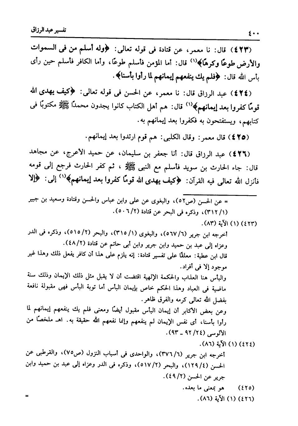 423 - قَالَ نا مَعْمَرٌ , عَنْ قَتَادَةَ , فِي قَوْلِهِ تَعَالَى: {§وَلَهُ أَسْلَمَ مَنْ فِي السَّمَوَاتِ وَالْأَرْضِ طَوْعًا وَكَرْهًا} قَالَ: أَمَّا الْمُؤْمِنُ فَأَسْلَمَ طَوْعًا , وَأَمَّا الْكَافِرُ فَأَسْلَمَ حِينَ رَأَى بَأْسَ اللَّهِ , قَالَ: {فَلَمْ يَكُ يَنْفَعُهُمْ إِيمَانُهُمْ لَمَّا رَأَوْا بَأْسَنَا} [غافر: 85]