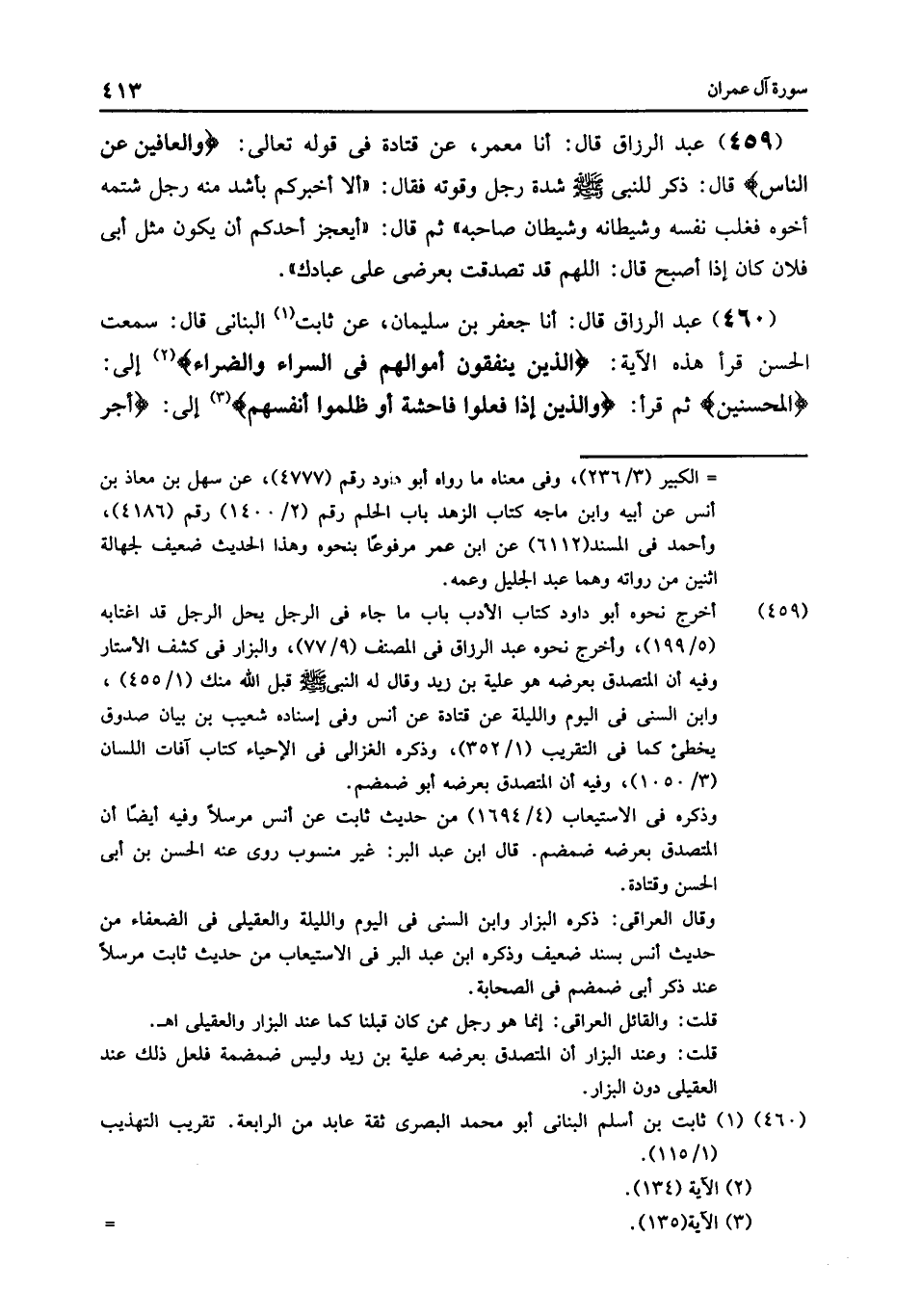 459 - قَالَ: أنا مَعْمَرٌ , عَنْ قَتَادَةَ , فِي قَوْلِهِ تَعَالَى: {§وَالْعَافِينَ عَنِ النَّاسِ} [آل عمران: 134] قَالَ: ذُكِرَ لِلنَّبِيِّ صَلَّى اللهُ عَلَيْهِ وَسَلَّمَ شِدَّةُ رَجُلٍ وَقُوَّتُهُ , فَقَالَ: «أَلَا أُخْبِرُكُمْ بِأَشَدَّ مِنْهُ؟ رَجُلٌ شَتْمُهُ أَخُوهُ فَغَلَبَ نَفْسَهُ وَشَيْطَانَهُ , وَشَيْطَانَ صَاحِبِهِ» , ثُمَّ قَالَ: «أَيَعْجِزُ أَحَدُكُمْ أَنْ يَكُونَ مِثْلَ أَبِي فُلَانٍ؟ كَانَ إِذَا أَصْبَحَ» قَالَ: «اللَّهُمَّ قَدْ تَصَدَّقْتُ بِعِرْضِي عَلَى عِبَادِكَ»