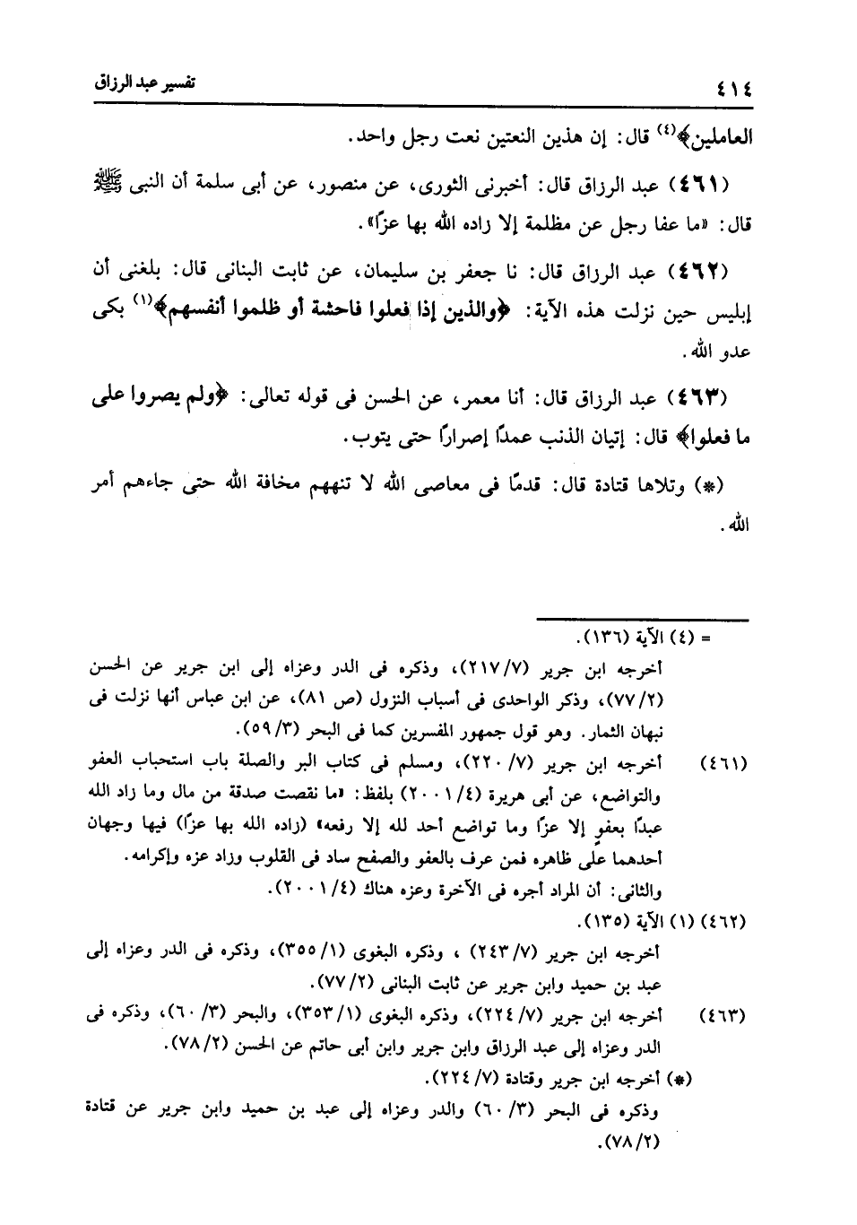 460 - قَالَ: أنا جَعْفَرُ بْنُ سُلَيْمَانَ , عَنْ ثَابِتٍ الْبُنَانِيِّ , قَالَ: سَمِعْتُ الْحَسَنَ , قَرَأَ هَذِهِ الْآيَةَ: {§الَّذِينَ يُنْفِقُونَ فِي السَّرَّاءِ وَالضَّرَّاءِ} [آل عمران: 134] إِلَى: {الْمُحْسِنِينَ} [آل عمران: 134] , ثُمَّ قَرَأَ: {وَالَّذِينَ إِذَا فَعَلُوا فَاحِشَةً أَوْ ظَلَمُوا أَنْفُسَهُمْ} [آل عمران: 135] إِلَى: {أَجْرُ الْعَامِلِينَ} [آل عمران: 136] , قَالَ: «إِنَّ هَذَيْنِ النَّعْتَيْنِ نَعْتُ رَجُلٍ وَاحِدٍ»