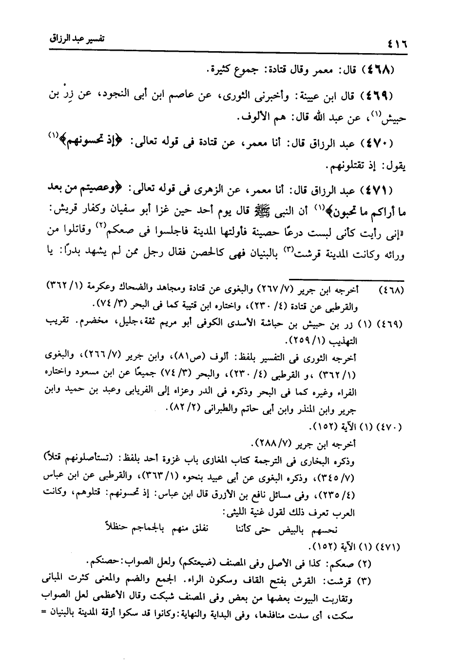 470 - قَالَ: أنا مَعْمَرٌ عَنْ قَتَادَةَ , فِي قَوْلِهِ تَعَالَى: {§إِذْ تَحُسُّونَهُمْ} [آل عمران: 152] يَقُولُ: «إِذْ تَقْتُلُونَهُمْ»
