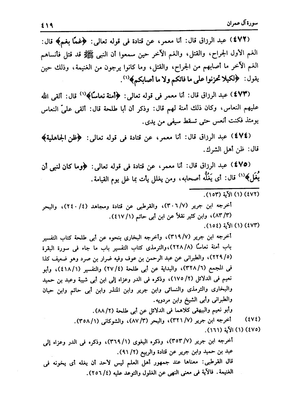 472 - قَالَ: أنا مَعْمَرٌ , عَنْ قَتَادَةَ , فِي قَوْلِهِ تَعَالَى: {§غَمًّا بِغَمٍّ "} [آل عمران: 153] قَالَ: «الْغَمُّ الْأَوَّلُ الْجَرَّاحُ وَالْقَتْلُ , وَالْغَمُّ الْآخَرُ حِينَ سَمِعُوا أَنَّ النَّبِيَّ صَلَّى اللهُ عَلَيْهِ وَسَلَّمَ قَدْ قُتِلَ , فَأَنْسَاهُمُ الْغَمُّ الْآخَرُ مَا أَصَابَهُمْ مِنَ الْجِرَاحِ وَالْقَتْلِ , وَمَا كَانُوا يَرْجُونَ مِنَ الْغَنِيمَةِ» وَذَلِكَ حِينَ يَقُولُ: {لِكَيْلَا تَحْزَنُوا عَلَى مَا فَاتَكُمْ , وَلَا مَا أَصَابَكُمْ "} [آل عمران: 153]