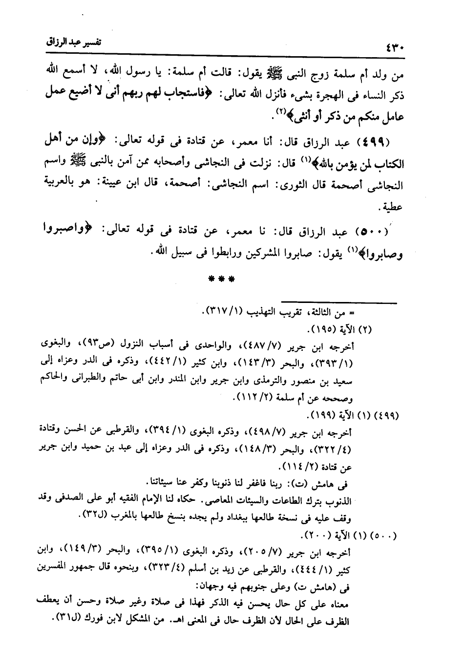 497 - قَالَ: أنا مَعْمَرٌ , عَنْ قَتَادَةَ , قَالَ: §إِنَّ أَهْلَ خَيْبَرَ أَتَوَا النَّبِيَّ صَلَّى اللهُ عَلَيْهِ وَسَلَّمَ وَأَصْحَابَهُ , فَقَالُوا: إِنَّا عَلَى رَأْيِكُمْ وَهَيْئَتِكُمْ , وَإِنَّا لَكُمْ وُدٌّ , فَأَكْذَبَهُمُ اللَّهُ وَقَالَ: {لَا تَحْسَبَنَّ الَّذِينَ يَفْرَحُونَ بِمَا أَتَوْا , وَيُحِبُّونَ أَنْ يُحْمَدُوا بِمَا لَمْ يَفْعَلُوا} [آل عمران: 188]