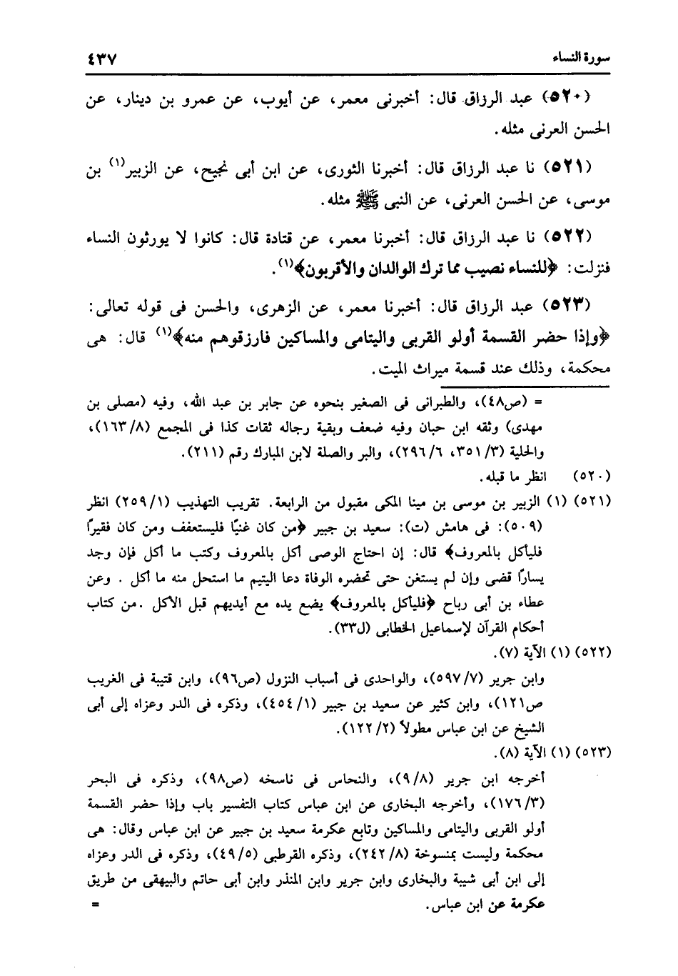 522 - أَخْبَرَنَا مَعْمَرٌ , عَنْ قَتَادَةَ , قَالَ: §كَانُوا لَا يُوَرِّثُونَ النِّسَاءَ , فَنَزَلَتْ: {وَلِلنِّسَاءِ نَصِيبٌ مِمَّا تَرَكَ الْوَالِدَانِ وَالْأَقْرَبُونَ} [النساء: 7]