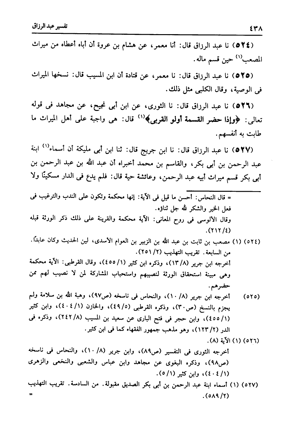 526 - نا عَبْدُ الرَّزَّاقِ قَالَ: نا الثَّوْرِيُّ , عَنِ ابْنِ أَبِي نَجِيحٍ , عَنْ مُجَاهِدٍ , فِي قَوْلِهِ تَعَالَى: {§وَإِذَا حَضَرَ الْقِسْمَةَ أُولُو الْقُرْبَى} قَالَ: «هِيَ وَاجِبَةٌ عَلَى أَهْلِ الْمِيرَاثِ مَا طَابَتْ بِهِ أَنْفُسُهُمْ»