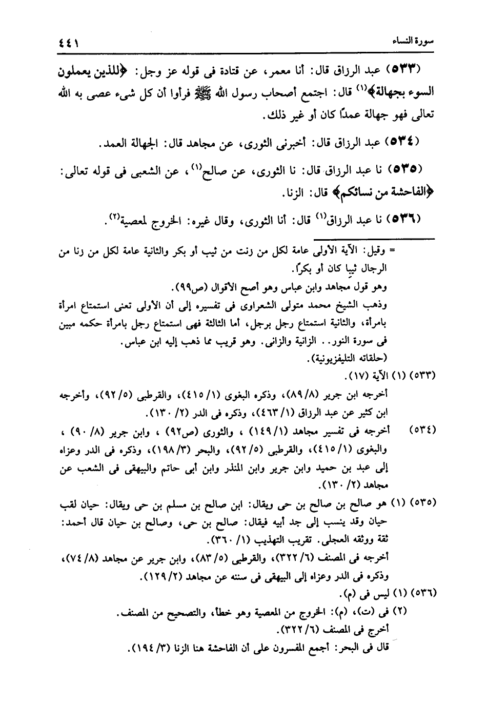 535 - نا عَبْدُ الرَّزَّاقِ قَالَ: نا الثَّوْرِيُّ , عَنْ صَالِحٍ , عَنِ الشَّعْبِيِّ , فِي قَوْلِهِ تَعَالَى: {§الْفَاحِشَةُ مِنْ نِسَائِكُمْ} [النساء: 15] قَالَ: «الزِّنَا»