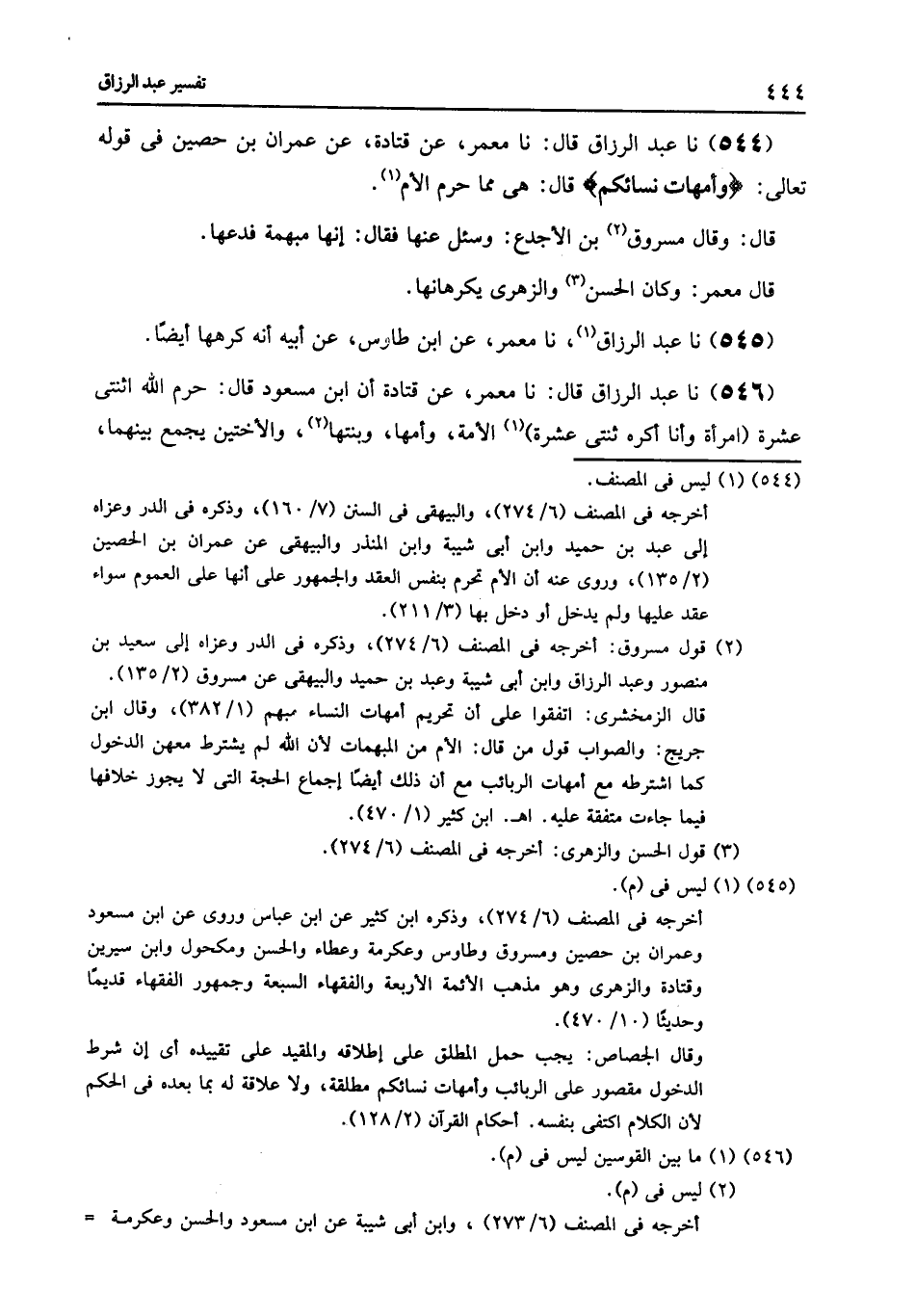 544 - نا عَبْدُ الرَّزَّاقِ قَالَ: نا مَعْمَرٌ , عَنْ قَتَادَةَ , عَنْ عِمْرَانَ بْنِ حُصَيْنٍ , فِي قَوْلِهِ تَعَالَى: {§وَأُمَّهَاتُ نِسَائِكُمْ} [النساء: 23] قَالَ: «هِيَ مِمَّا حَرَّمَ الْأُمَّ» قَالَ: وَقَالَ مَسْرُوقُ بْنُ الْأَجْدَعِ وَسُئِلَ عَنْهَا , فَقَالَ: «إِنَّهَا مُبْهَمَةٌ , فَدَعْهَا» قَالَ مَعْمَرٌ: وَكَانَ الْحَسَنُ وَالزُّهْرِيُّ يَكْرَهَانِهَا