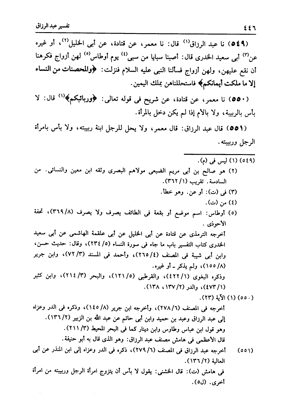 549 - نا عَبْدُ الرَّزَّاقِ قَالَ: نا مَعْمَرٌ , عَنْ قَتَادَةَ , عَنْ أَبِي الْخَلِيلِ , أَوْ غَيْرِهِ , عَنْ أَبِي سَعِيدٍ الْخُدْرِيِّ , قَالَ: " §أَصَبْنَا سَبَايَا مِنْ سَبْيِ يَوْمِ أَوْطَاسٍ لَهُنَّ أَزْوَاجٌ , فَكَرِهْنَا أَنْ نَقَعَ عَلَيْهِنَّ وَلَهُنَّ أَزْوَاجٌ , فَسَأَلْنَا النَّبِيَّ عَلَيْهِ السَّلَامُ , فَنَزَلَتْ: {وَالْمُحْصَنَاتُ مِنَ النِّسَاءِ إِلَّا مَا مَلَكَتْ أَيْمَانُكُمْ} [النساء: 24] فَاسْتَحْلَلْنَاهُنَّ بِمِلْكِ الْيَمِينِ