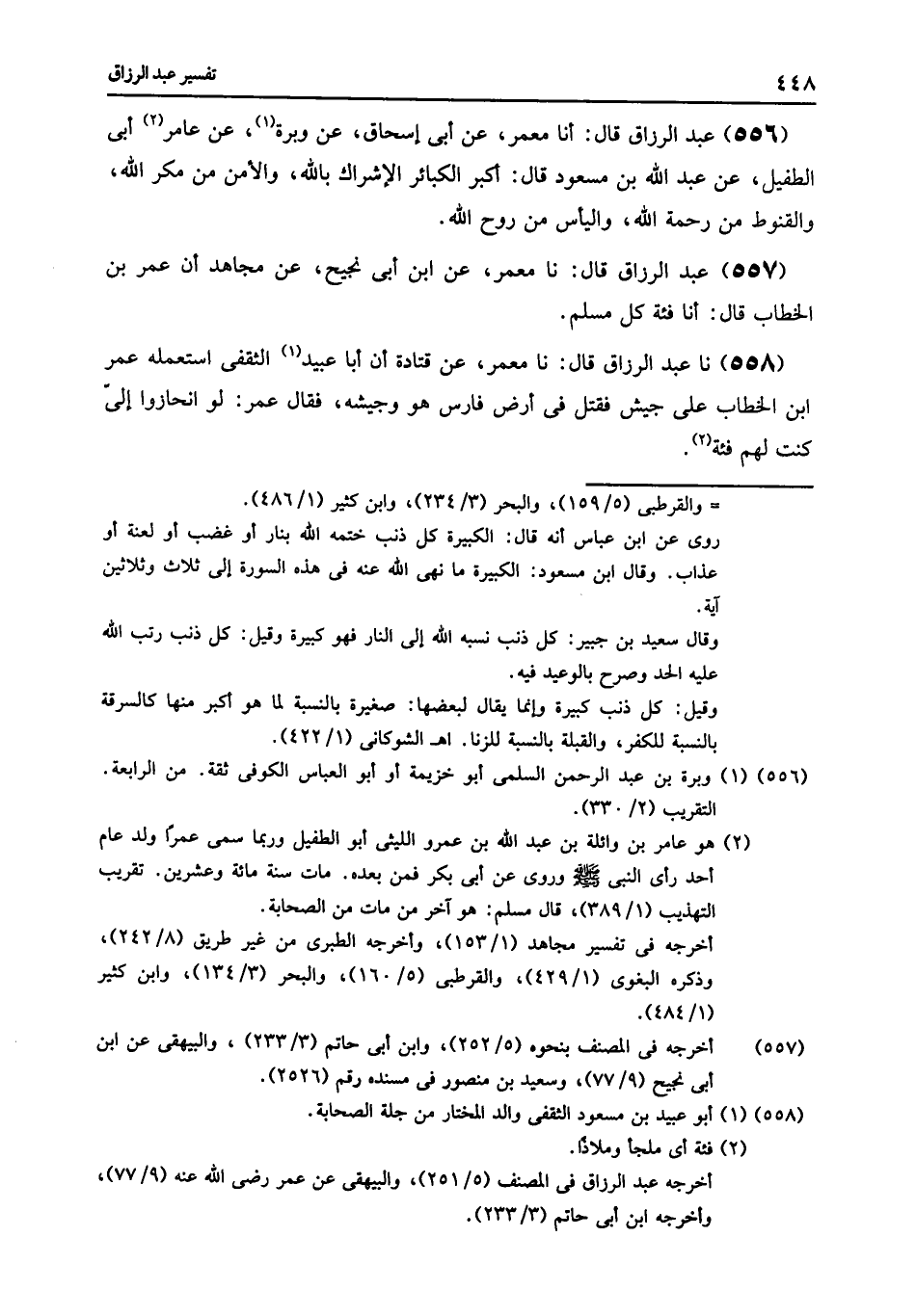 556 - قَالَ: أنا مَعْمَرٌ , عَنْ أَبِي إِسْحَاقَ , عَنْ وَبَرَةَ , عَنْ عَامِرٍ أَبِي الطُّفَيْلِ , عَنْ عَبْدِ اللَّهِ بْنِ مَسْعُودٍ , قَالَ: «§أَكْبَرُ الْكَبَائِرِ الْإِشْرَاكُ بِاللَّهِ , وَالْأَمْنُ مِنْ مَكْرِ اللَّهِ , وَالْقَنُوطُ مِنْ رَحْمَةِ اللَّهِ , وَالْيَأْسُ مِنْ رَوْحِ اللَّهِ»