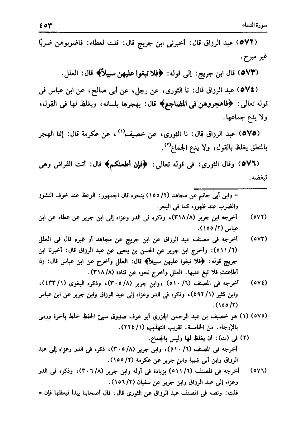573 - قَالَ ابْنُ جُرَيْجٍ إِلَى قَوْلِهِ: {§فَلَا تَبْغُوا عَلَيْهِنَّ سَبِيلًا} [النساء: 34] قَالَ: «الْعِلَلُ»