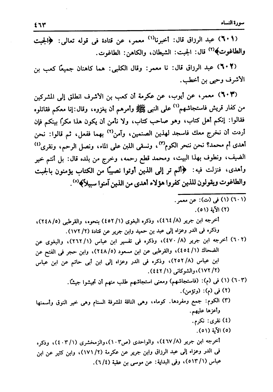603 - مَعْمَرٌ , عَنْ أَيُّوبَ , عَنْ عِكْرِمَةَ , أَنَّ كَعْبَ بْنَ الْأَشْرَفِ , §انْطَلَقَ إِلَى الْمُشْرِكِينَ مِنْ كُفَّارِ قُرَيْشٍ , فَاسْتَجَاشَهُمْ عَلَى النَّبِيِّ صَلَّى اللهُ عَلَيْهِ وَسَلَّمَ , وَأَمَرَهُمْ أَنْ يَغْزُوهُ , وَقَالَ: إِنَّا مَعَكُمْ فَقَاتِلُوهُ , فَقَالُوا: إِنَّكُمْ أَهْلُ كِتَابٍ , وَهُوَ صَاحِبُ كِتَابٍ , وَلَا نَأْمَنُ أَنْ يَكُونَ هَذَا مَكْرًا بَيْنَكُمْ , فَإِنْ أَرَدْتَ أَنْ نَخْرُجَ مَعَكَ فَاسْجُدْ لِهَذَيْنِ الصَّنَمَيْنِ , وَآمِنْ بِهِمَا , فَفَعَلَ , ثُمَّ قَالُوا: «نَحْنُ أَهْدَى أَمْ مُحَمَّدٌ؟» نَحْنُ نَنْحَرُ الْكُومَ , وَنَسْقِي اللَّبَنَ عَلَى الْمَاءِ , وَنَصِلُ الرَّحِمَ , وَنَقْرِي الضَّيْفَ , وَنَطُوفُ بِهَذَا الْبَيْتِ , وَمُحَمَّدٌ قَطَعَ رَحِمَهُ , وَخَرَجَ مِنْ بَلَدِهِ , قَالَ: بَلْ أَنْتُمْ خَيْرٌ وَأَهْدَى , فَنَزَلَتْ فِيهِ: {أَلَمْ تَرَ إِلَى الَّذِينَ أُوتُوا نَصِيبًا مِنَ الْكِتَابِ يُؤْمِنُونَ بِالْجِبْتِ , وَالطَّاغُوتِ , وَيَقُولُونَ لِلَّذِينَ كَفَرُوا هَؤُلَاءِ أَهْدَى مِنَ الَّذِينَ آمَنُوا سَبِيلًا} [النساء: 51]