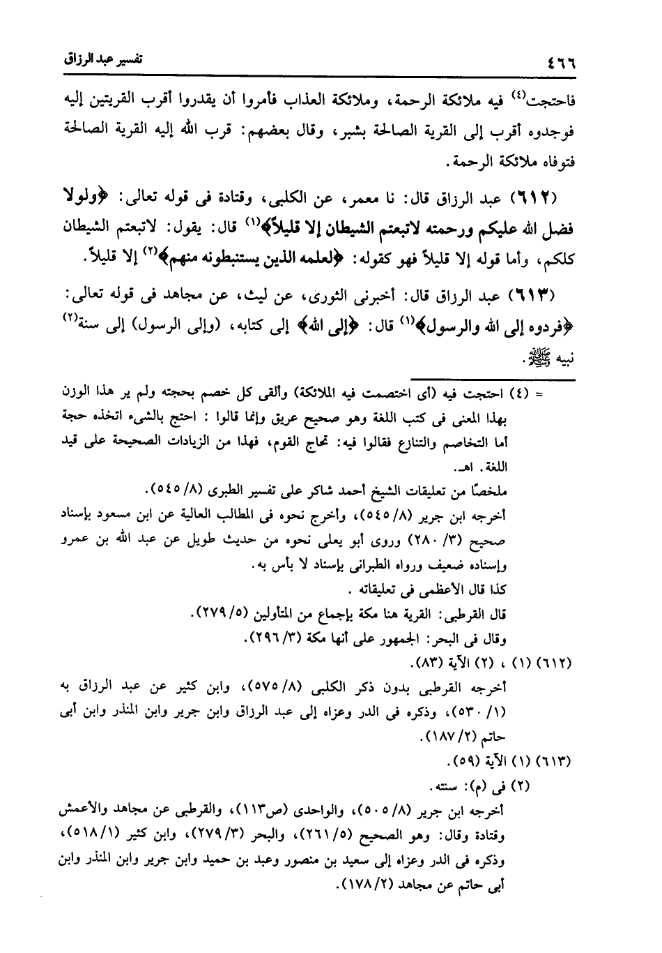 612 - نا مَعْمَرٌ , عَنِ الْكَلْبِيِّ , وَقَتَادَةَ , فِي قَوْلِهِ تَعَالَى: {§وَلَوْلَا فَضْلُ اللَّهِ عَلَيْكُمْ وَرَحْمَتُهُ لَاتَّبَعْتُمُ الشَّيْطَانَ إِلَّا قَلِيلًا} [النساء: 83] قَالَ: يَقُولُ: لَاتَّبَعْتُمُ الشَّيْطَانَ كُلُّكُمْ , وَأَمَّا قَوْلُهُ: {إِلَّا قَلِيلًا} [البقرة: 83] فَهُوَ كَقَوْلِهِ: {لَعَلِمَهُ الَّذِينَ يَسْتَنْبِطُونَهُ مِنْهُمْ} [النساء: 83] , إِلَّا قَلِيلًا