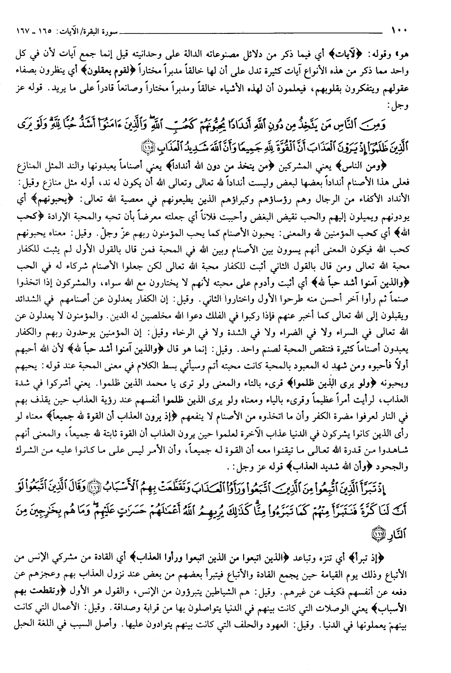 وَمِنَ النَّاسِ مَنْ يَتَّخِذُ مِنْ دُونِ اللَّهِ أَنْداداً يُحِبُّونَهُمْ كَحُبِّ اللَّهِ وَالَّذِينَ آمَنُوا أَشَدُّ حُبًّا لِلَّهِ وَلَوْ يَرَى الَّذِينَ ظَلَمُوا إِذْ يَرَوْنَ الْعَذابَ أَنَّ الْقُوَّةَ لِلَّهِ جَمِيعاً وَأَنَّ اللَّهَ شَدِيدُ الْعَذابِ (165)