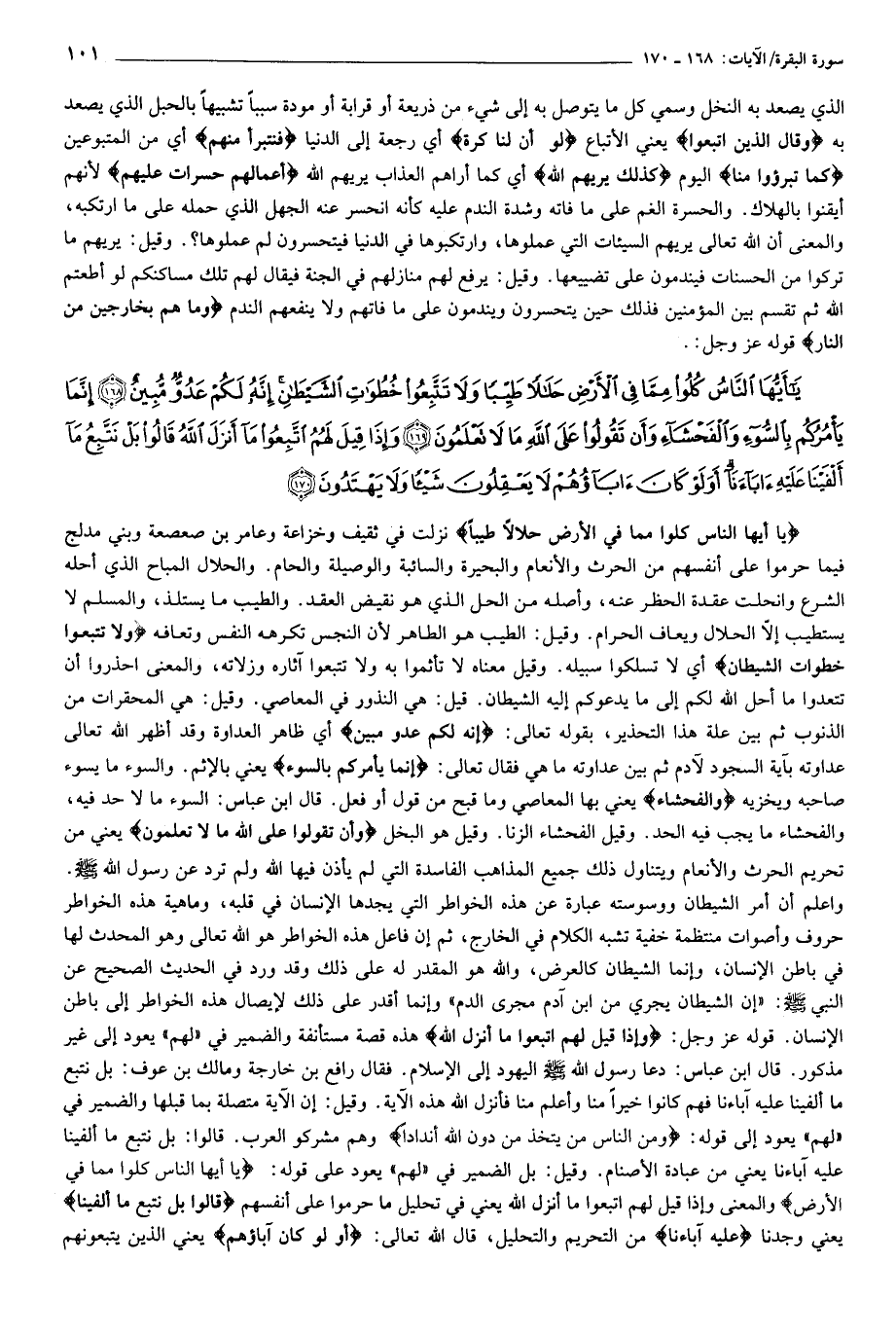 يا أَيُّهَا النَّاسُ كُلُوا مِمَّا فِي الْأَرْضِ حَلالًا طَيِّباً نزلت في ثقيف وخزاعة وعامر بن صعصعة وبني مدلج فيما حرموا على أنفسهم من الحرث والأنعام والبحيرة والسائبة والوصيلة والحام. والحلال المباح الذي أحله الشرع وانحلت عقدة الحظر عنه، وأصله من الحل الذي هو نقيض العقد. والطيب ما يستلذ، والمسلم لا يستطيب إلّا الحلال ويعاف الحرام. وقيل: الطيب هو الطاهر لأن النجس تكرهه النفس وتعافه وَلا تَتَّبِعُوا خُطُواتِ الشَّيْطانِ أي لا تسلكوا سبيله. وقيل معناه لا تأثموا به ولا تتبعوا آثاره وزلاته، والمعنى احذروا أن تتعدوا ما أحل الله لكم إلى ما يدعوكم إليه الشيطان. قيل: هي النذور في المعاصي. وقيل: هي المحقرات من الذنوب ثم بين علة هذا التحذير، بقوله تعالى: إِنَّهُ لَكُمْ عَدُوٌّ مُبِينٌ أي ظاهر العداوة وقد أظهر الله تعالى عداوته بآية السجود لآدم ثم بين عداوته ما هي فقال تعالى: إِنَّما يَأْمُرُكُمْ بِالسُّوءِ يعني بالإثم. والسوء ما يسوء صاحبه ويخزيه وَالْفَحْشاءِ يعني بها المعاصي وما قبح من قول أو فعل. قال ابن عباس: السوء ما لا حد فيه، والفحشاء ما يجب فيه الحد. وقيل الفحشاء الزنا. وقيل هو البخل وَأَنْ تَقُولُوا عَلَى اللَّهِ ما لا تَعْلَمُونَ يعني من تحريم الحرث والأنعام ويتناول ذلك جميع المذاهب الفاسدة التي لم يأذن فيها الله ولم ترد عن رسول الله صلّى الله عليه وسلّم.