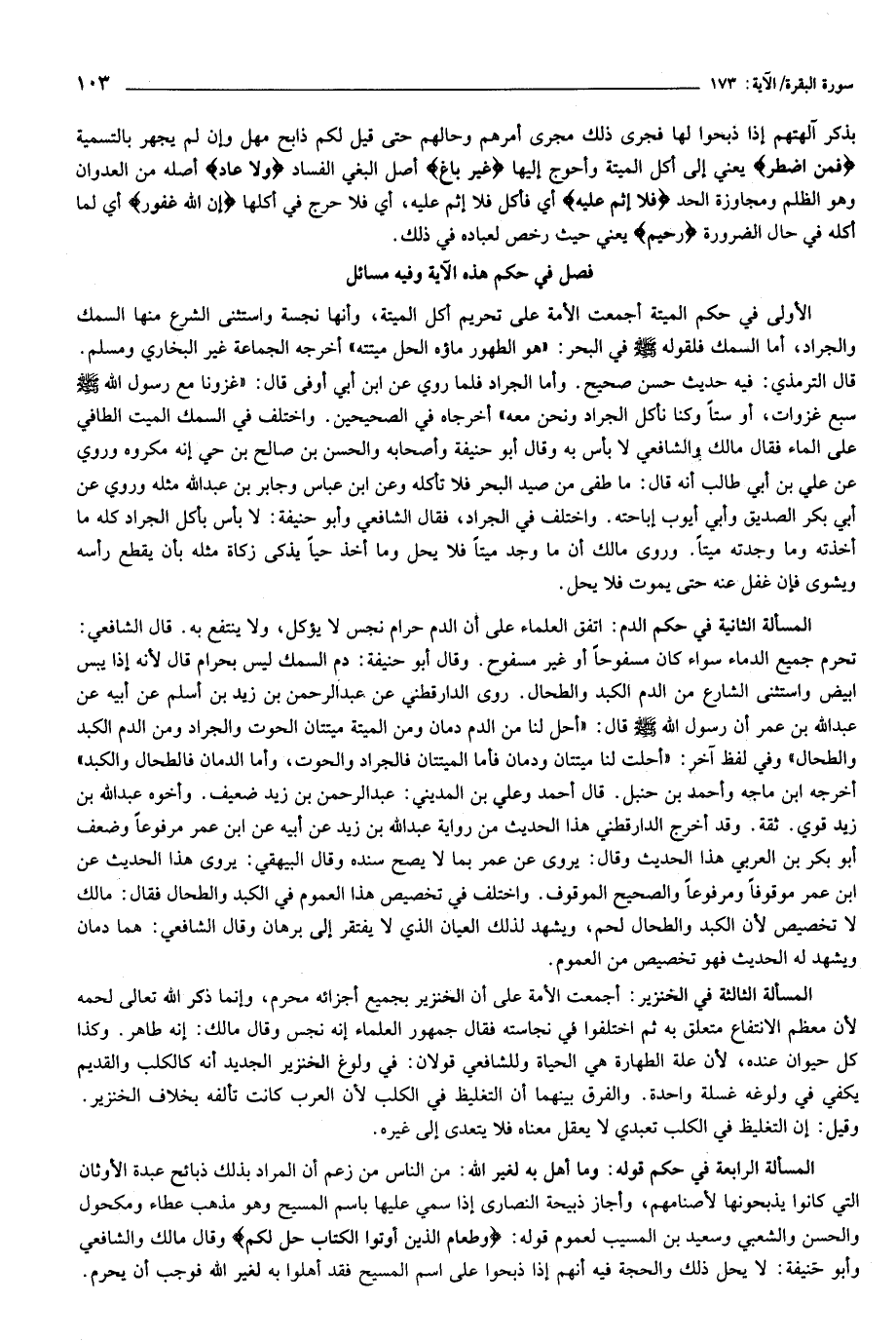 (فصل في حكم هذه الآية وفيه مسائل) الأولى في حكم الميتة أجمعت الأمة على تحريم أكل الميتة، وأنها نجسة واستثنى الشرع منها السمك والجراد، أما السمك فلقوله صلّى الله عليه وسلّم في البحر: «هو الطهور ماؤه الحل ميتته» أخرجه الجماعة غير البخاري ومسلم.